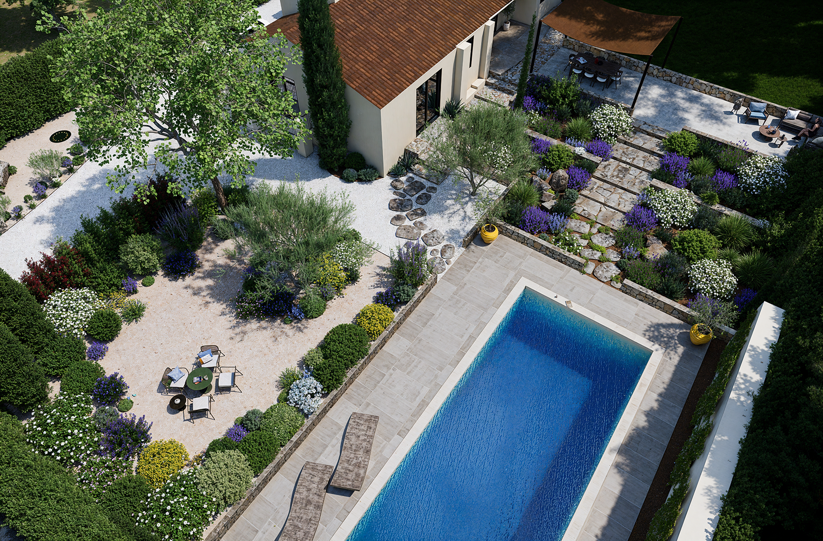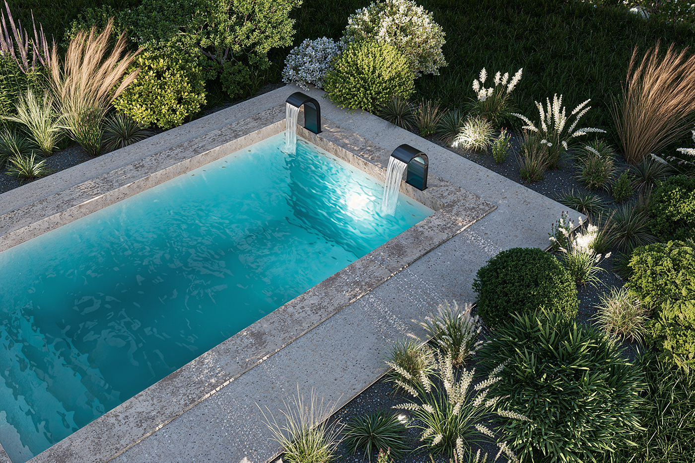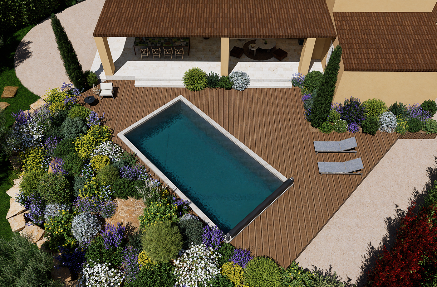 Chaque projet est livré clé en main, avec des fichiers prêts à être utilisés sur tous vos supports de communication. Le projet intègre vos options : skimmers, refoulements, abri piscine, volet roulant, robot de nettoyage, margelles, mobilier, etc.