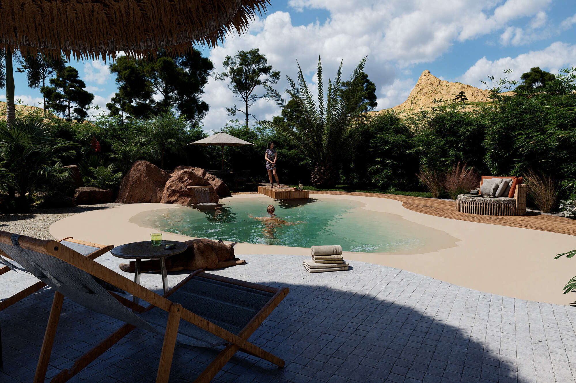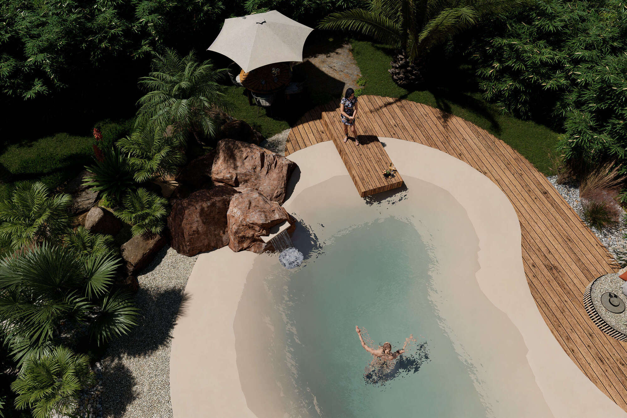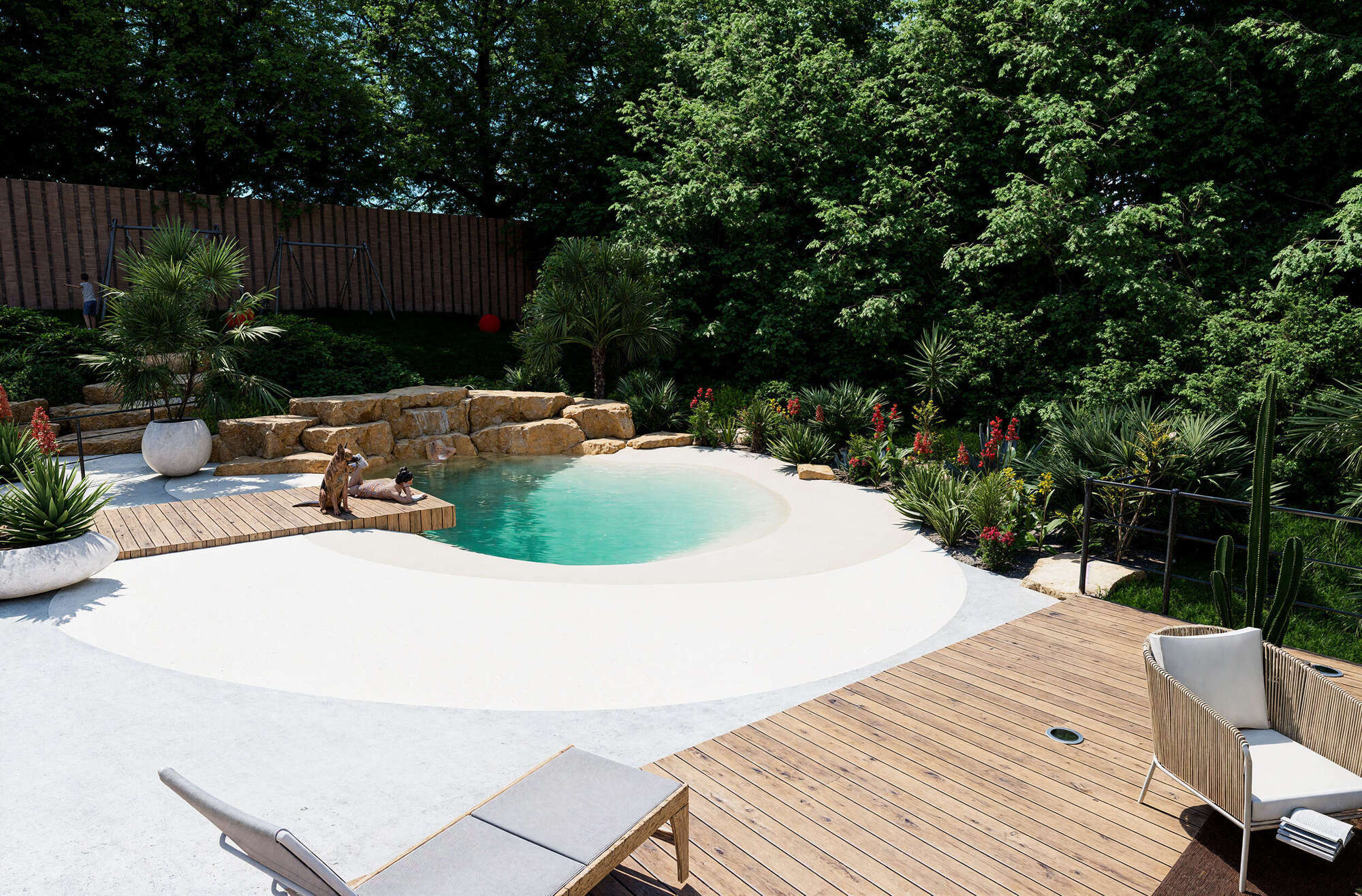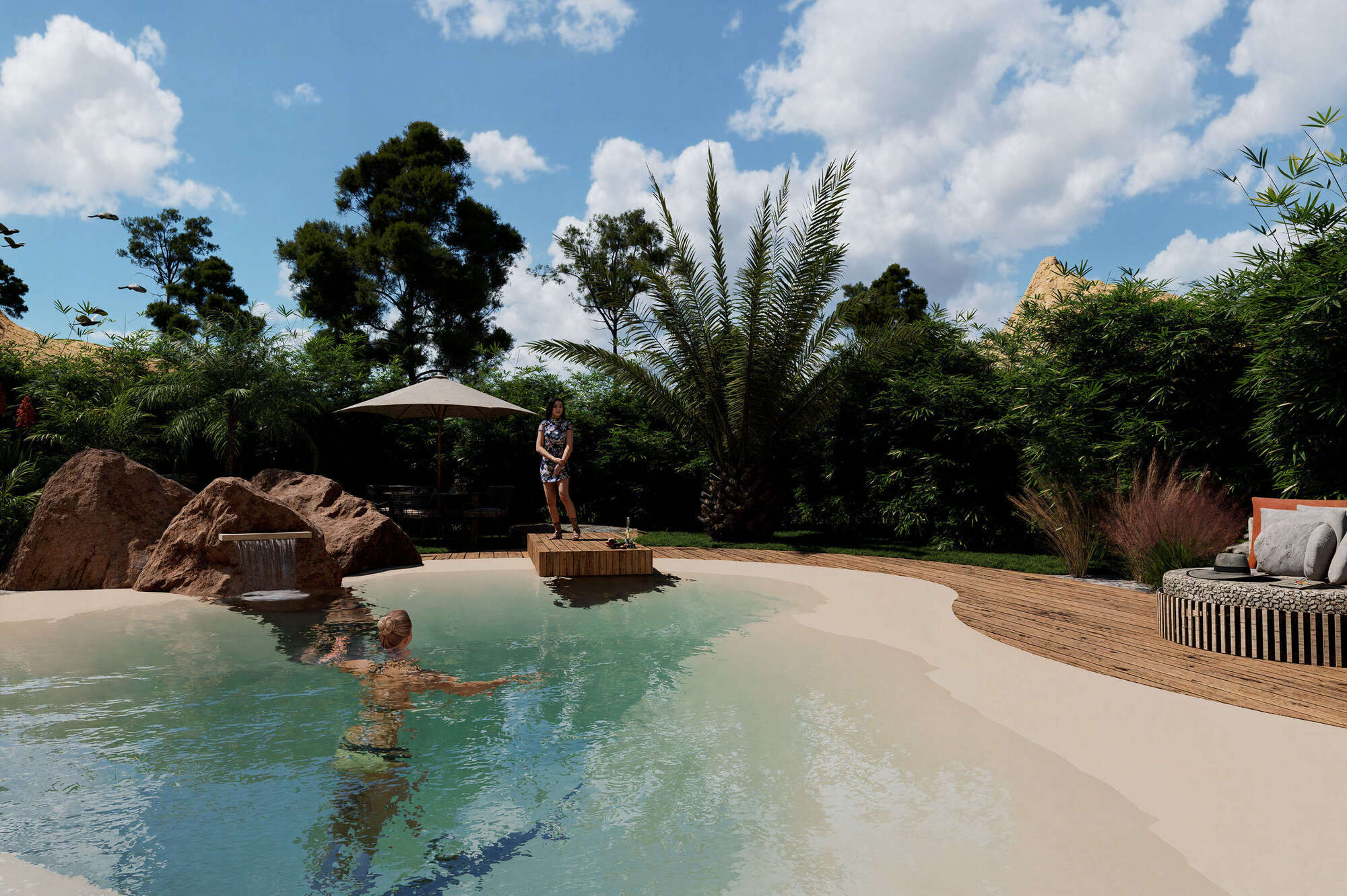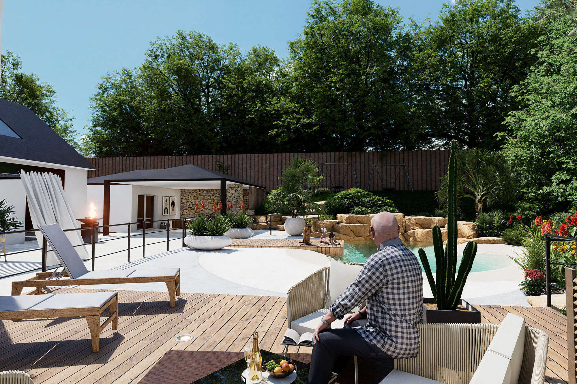 Une piscine lagon aux courbes naturelles s’intègre dans un jardin paysager, agrémenté d’une terrasse en bois chaleureuse. Un pool house raffiné complète l’ensemble pour créer un espace de détente élégant et convivial