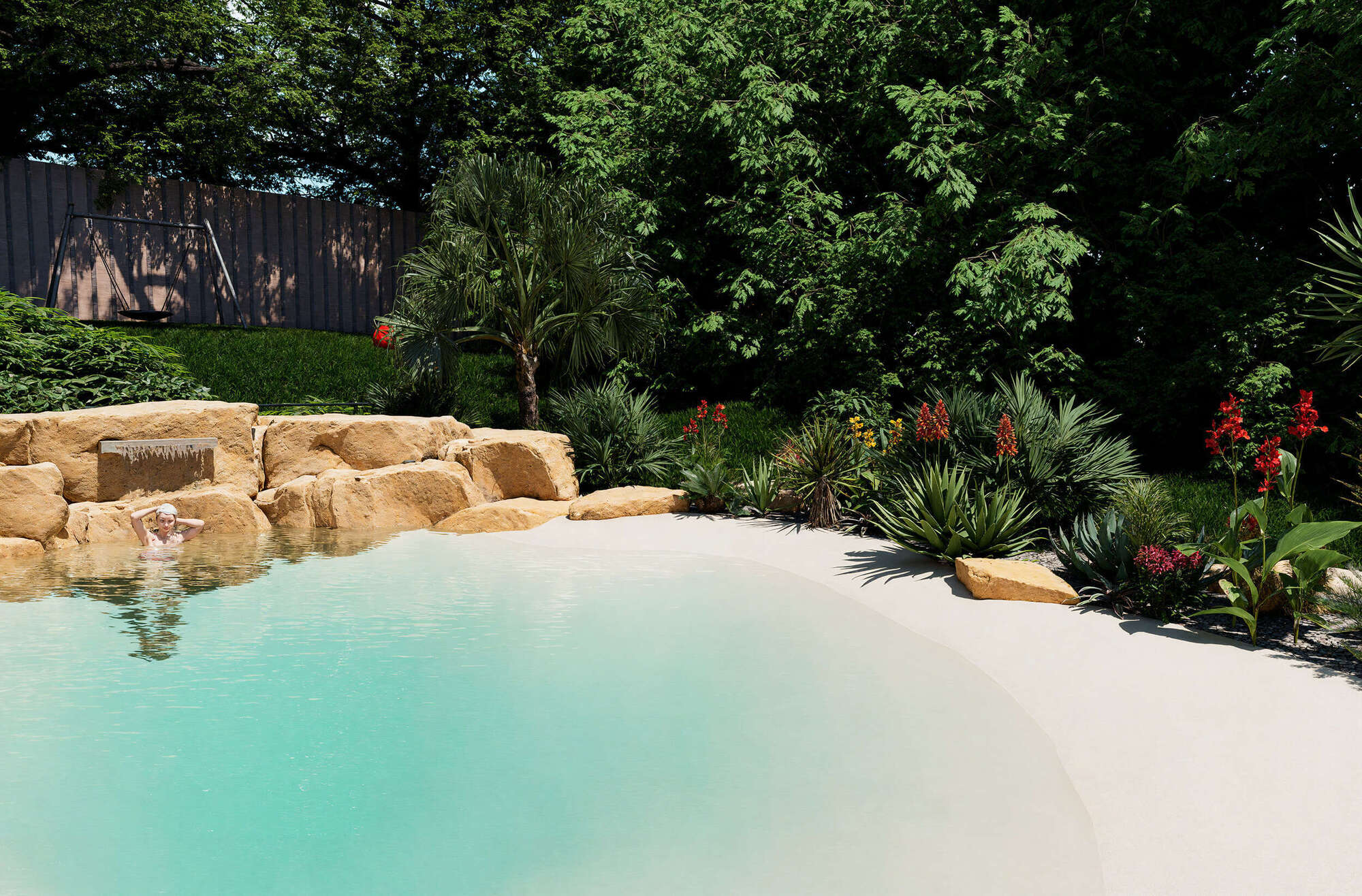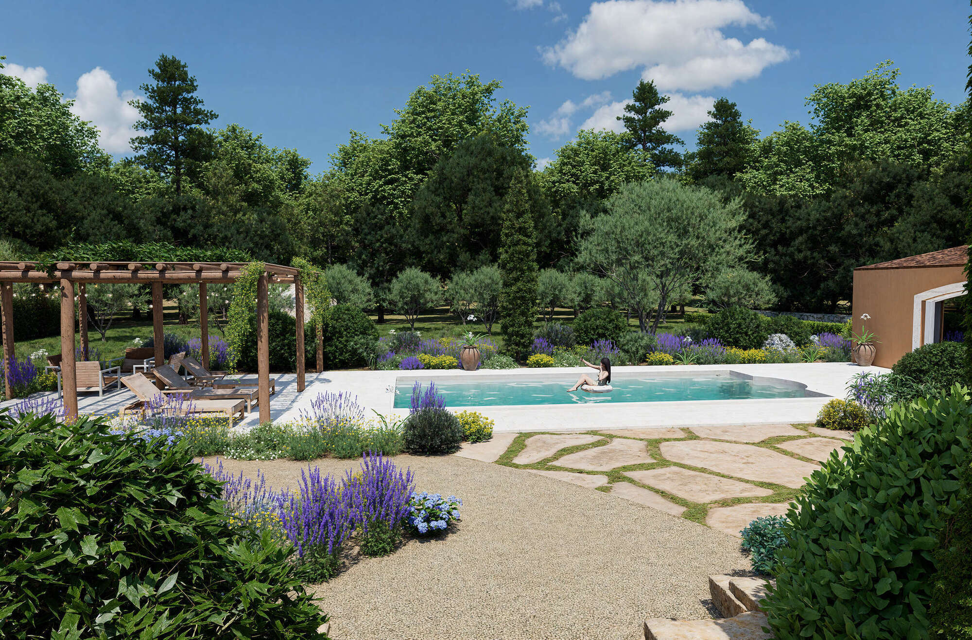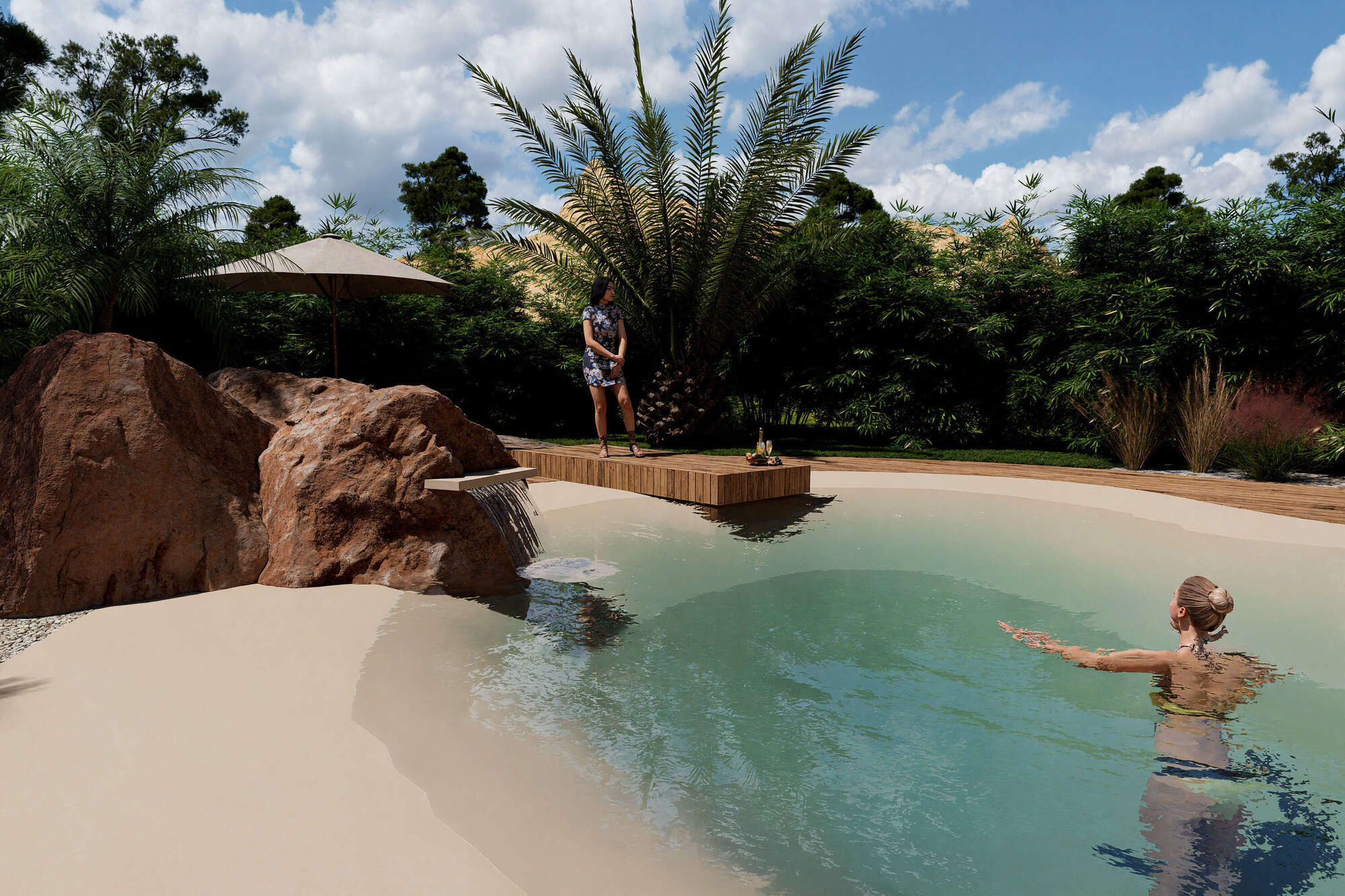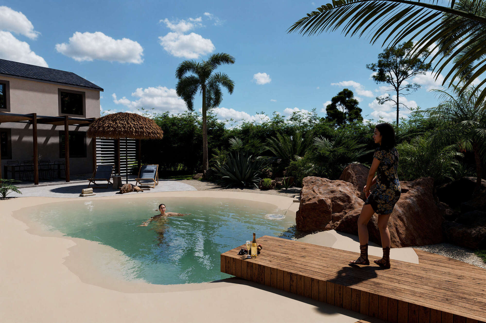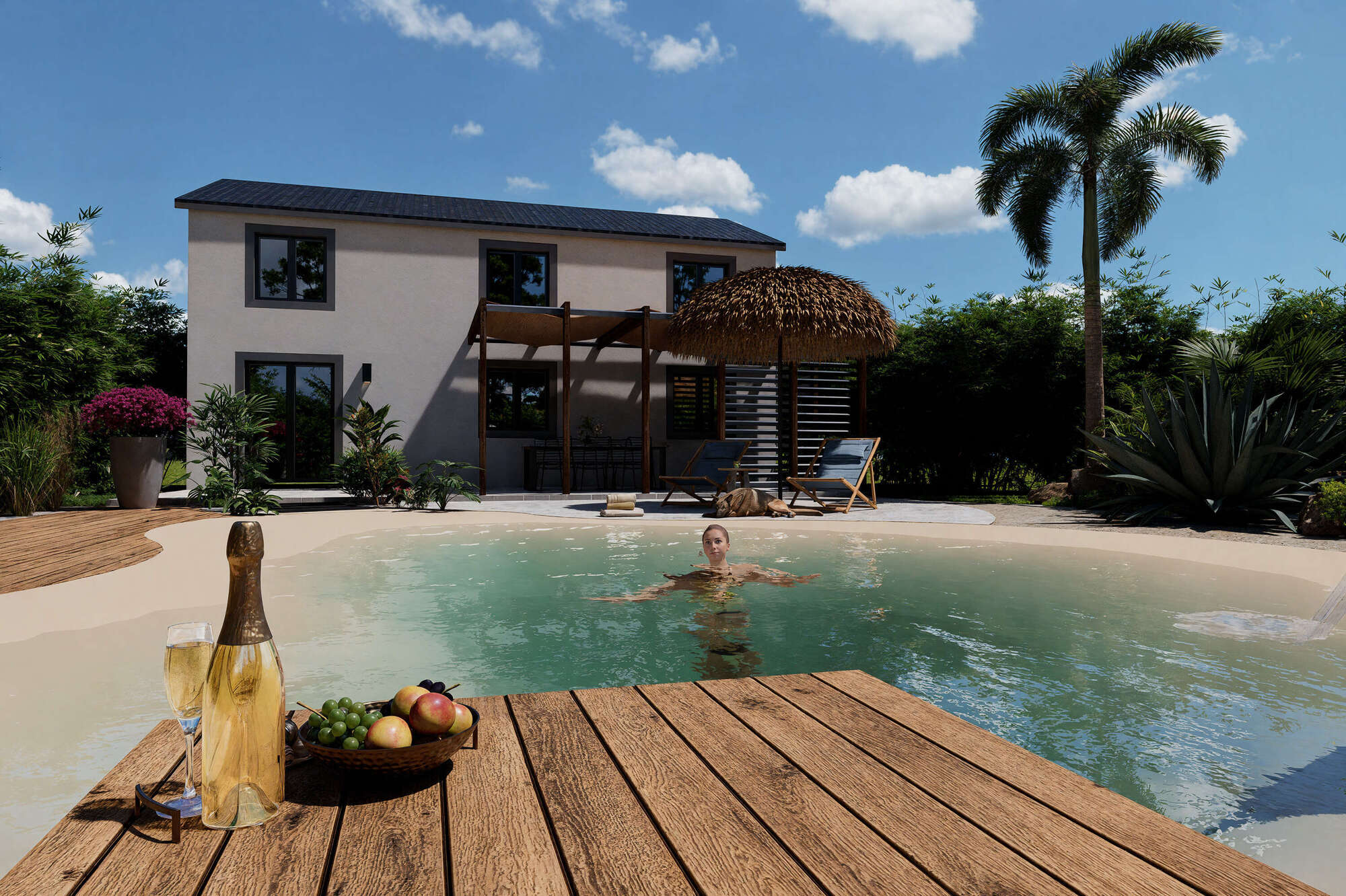 Une piscine lagon aux courbes naturelles s’intègre dans un jardin paysager, agrémenté d’une terrasse en bois chaleureuse. Un pool house raffiné complète l’ensemble pour créer un espace de détente élégant et convivial