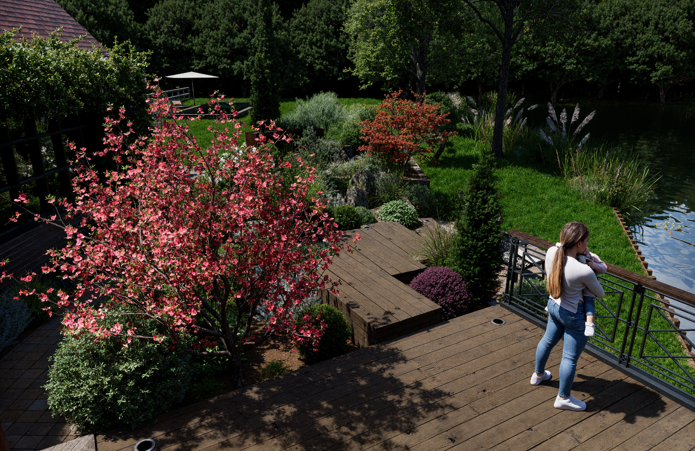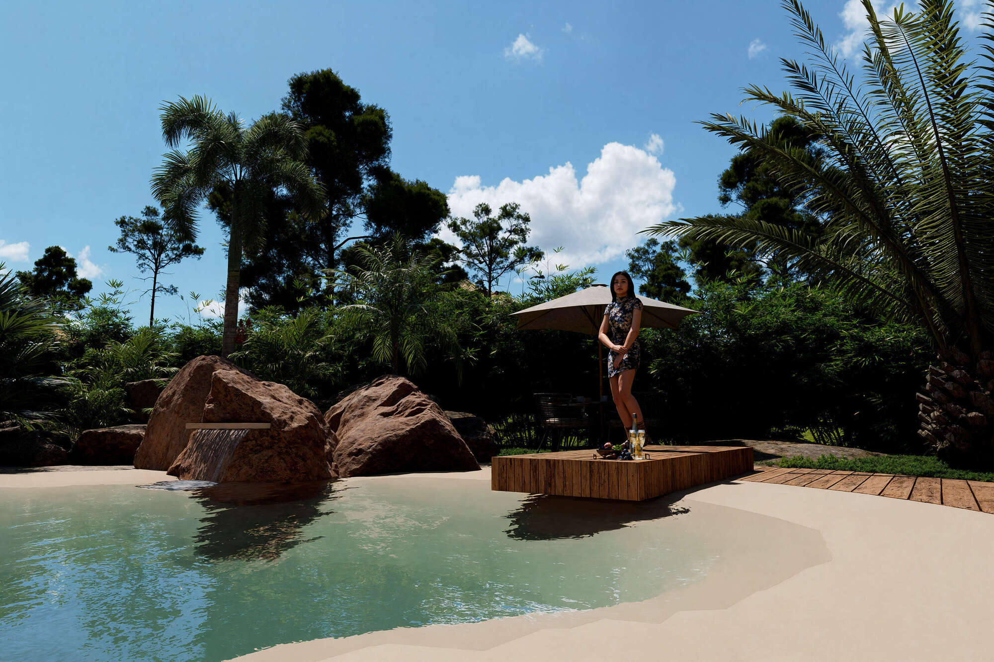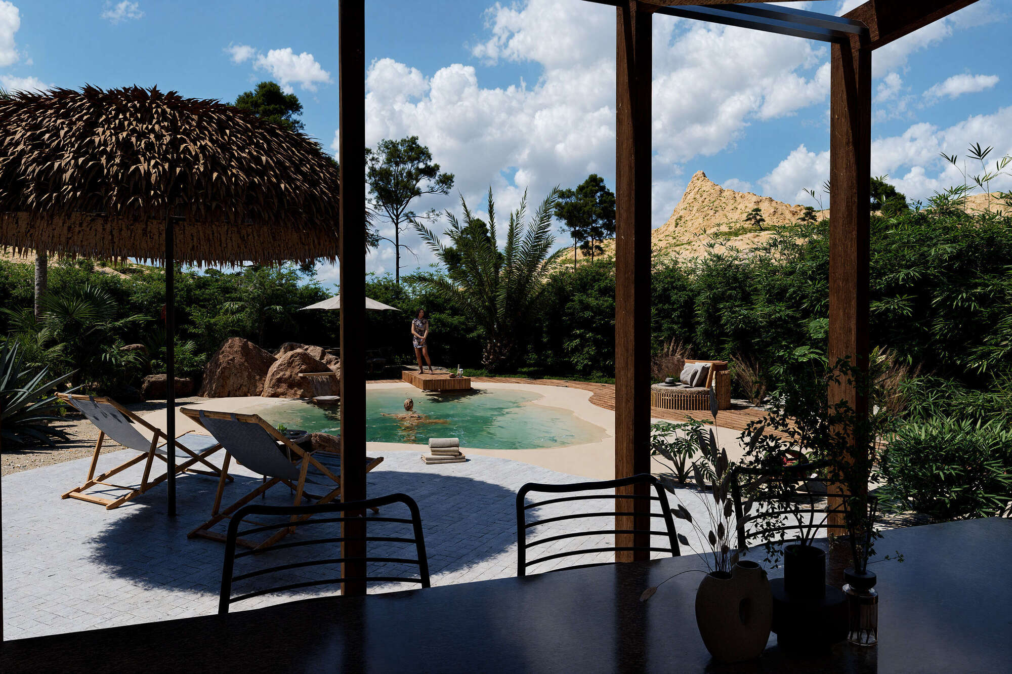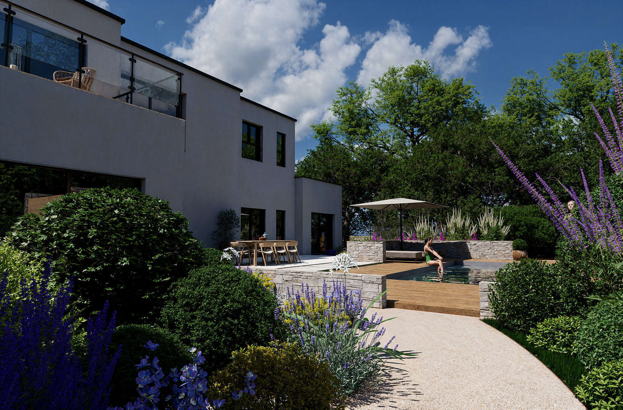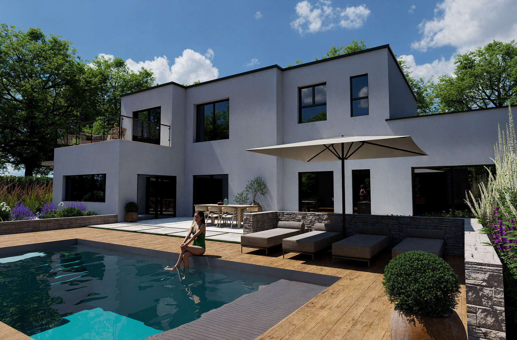 Une piscine lagon aux courbes naturelles s’intègre dans un jardin paysager, agrémenté d’une terrasse en bois chaleureuse. Un pool house raffiné complète l’ensemble pour créer un espace de détente élégant et convivial
