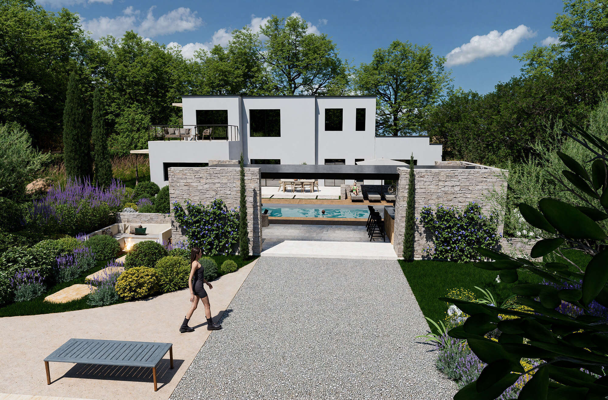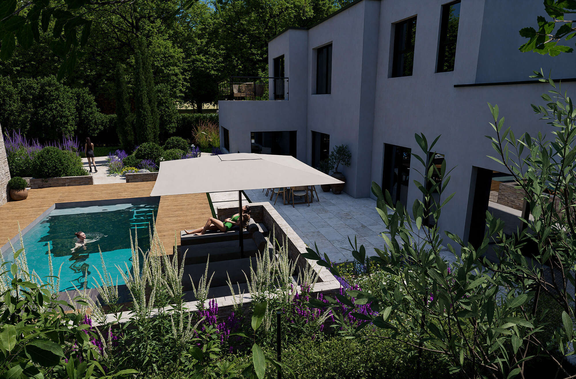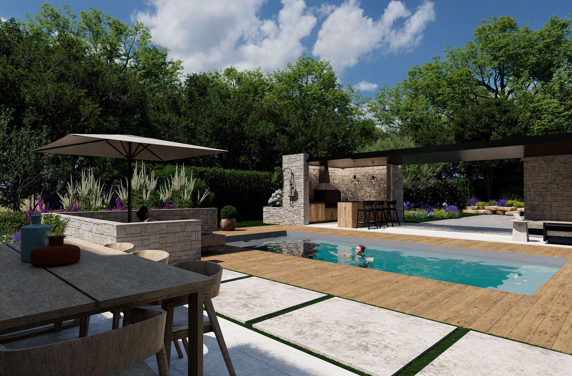Aménagement extérieur d'une maison, création d'une pergola, piscine et cuisine extérieur