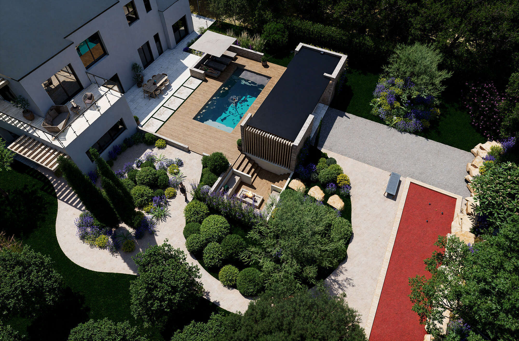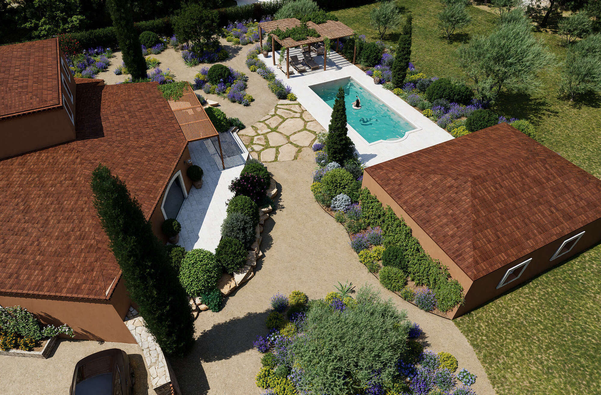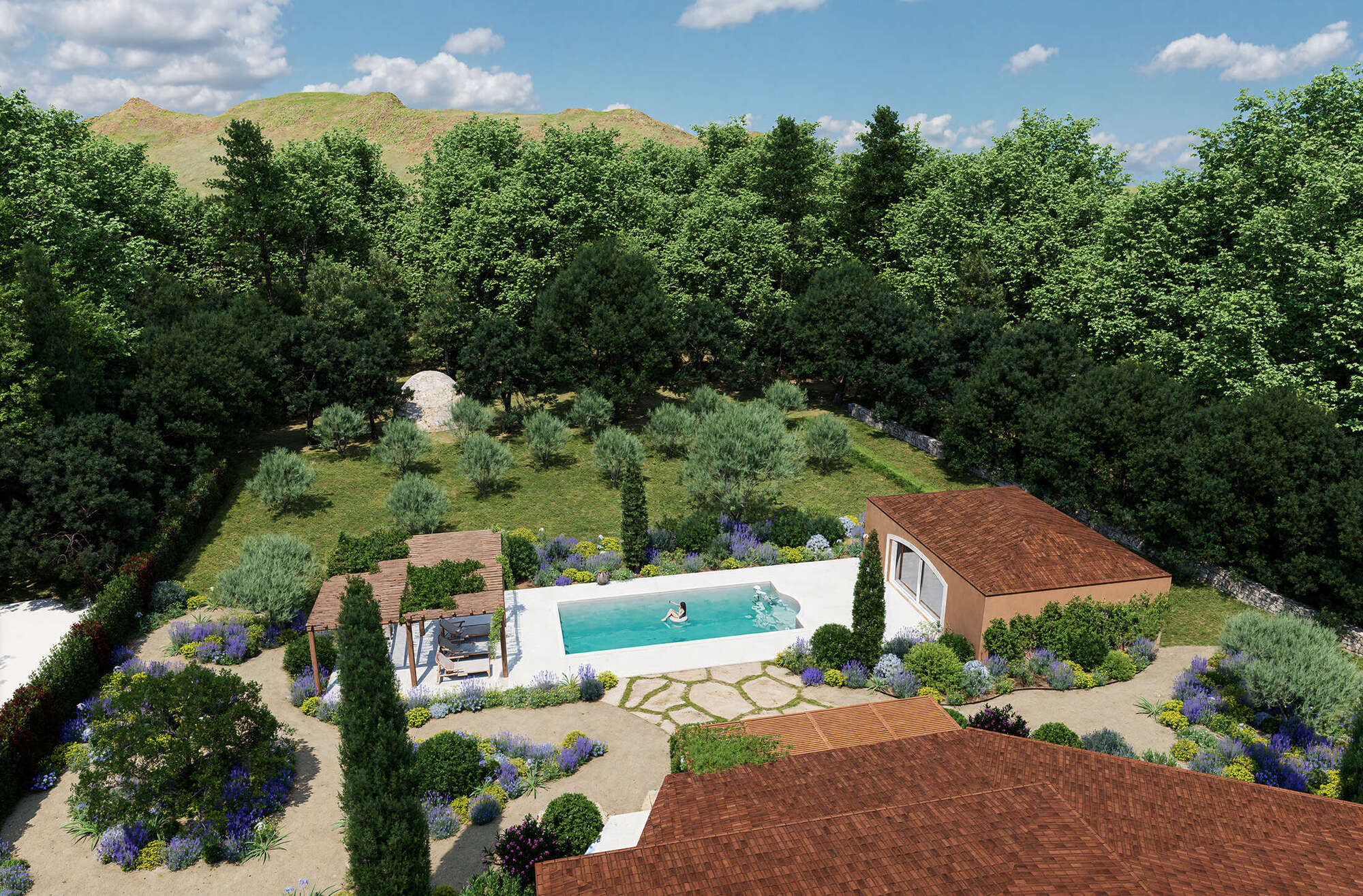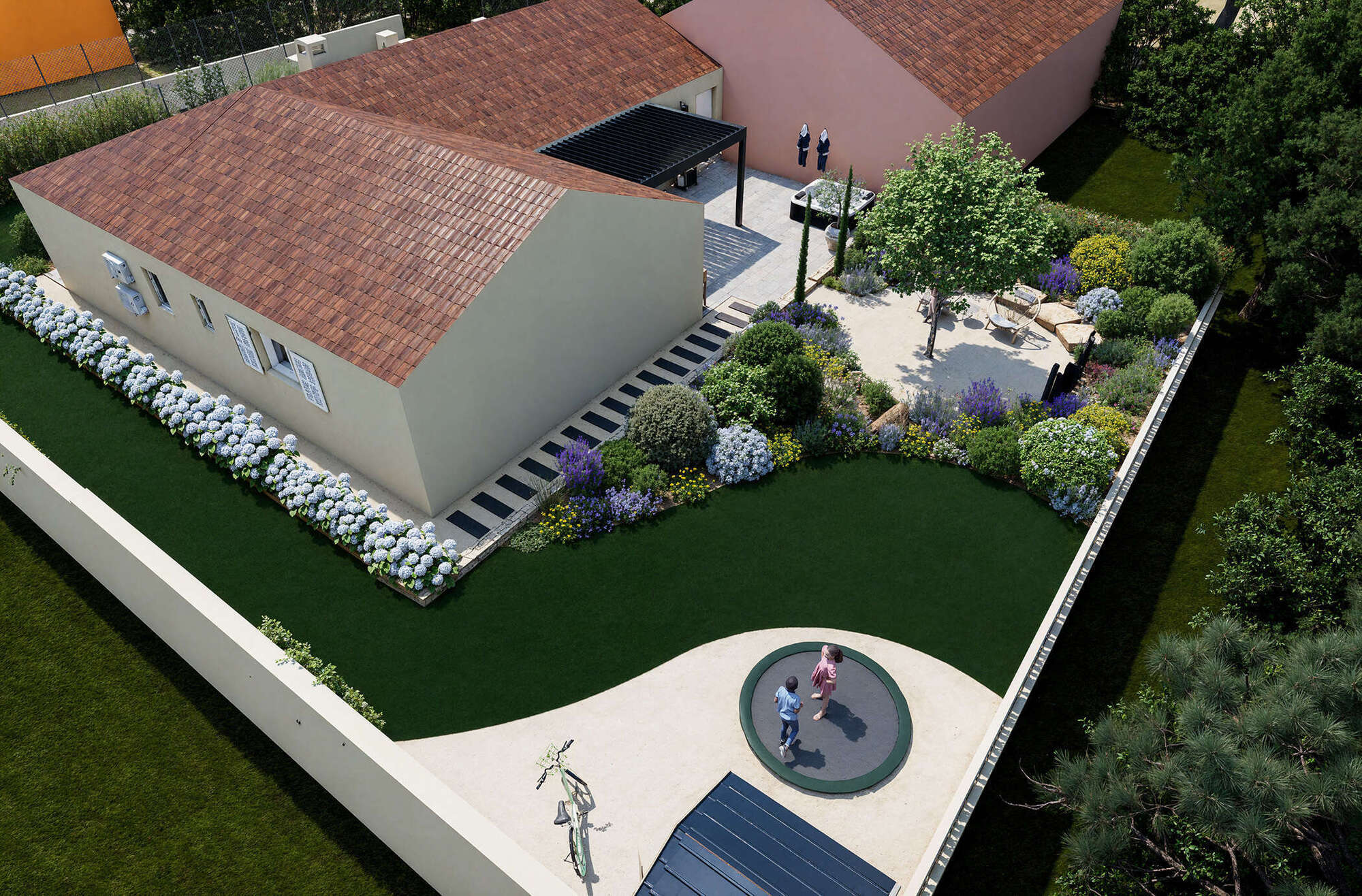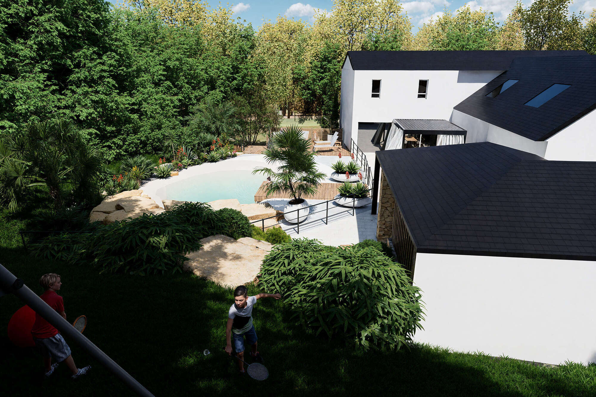 Voici un projet d'aménagement paysager pour une maison, espace pisicine, et coin jeu pour les enfants