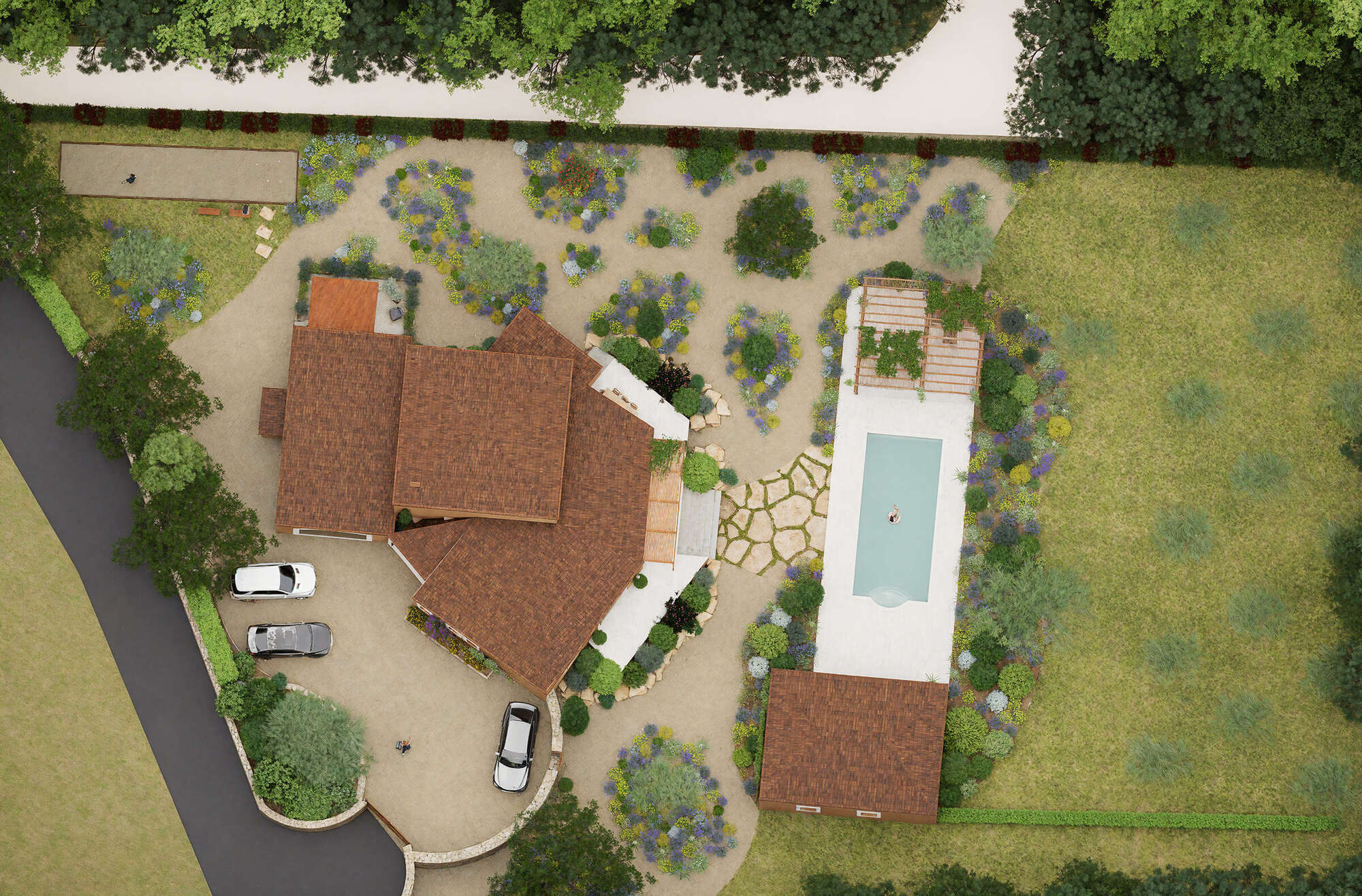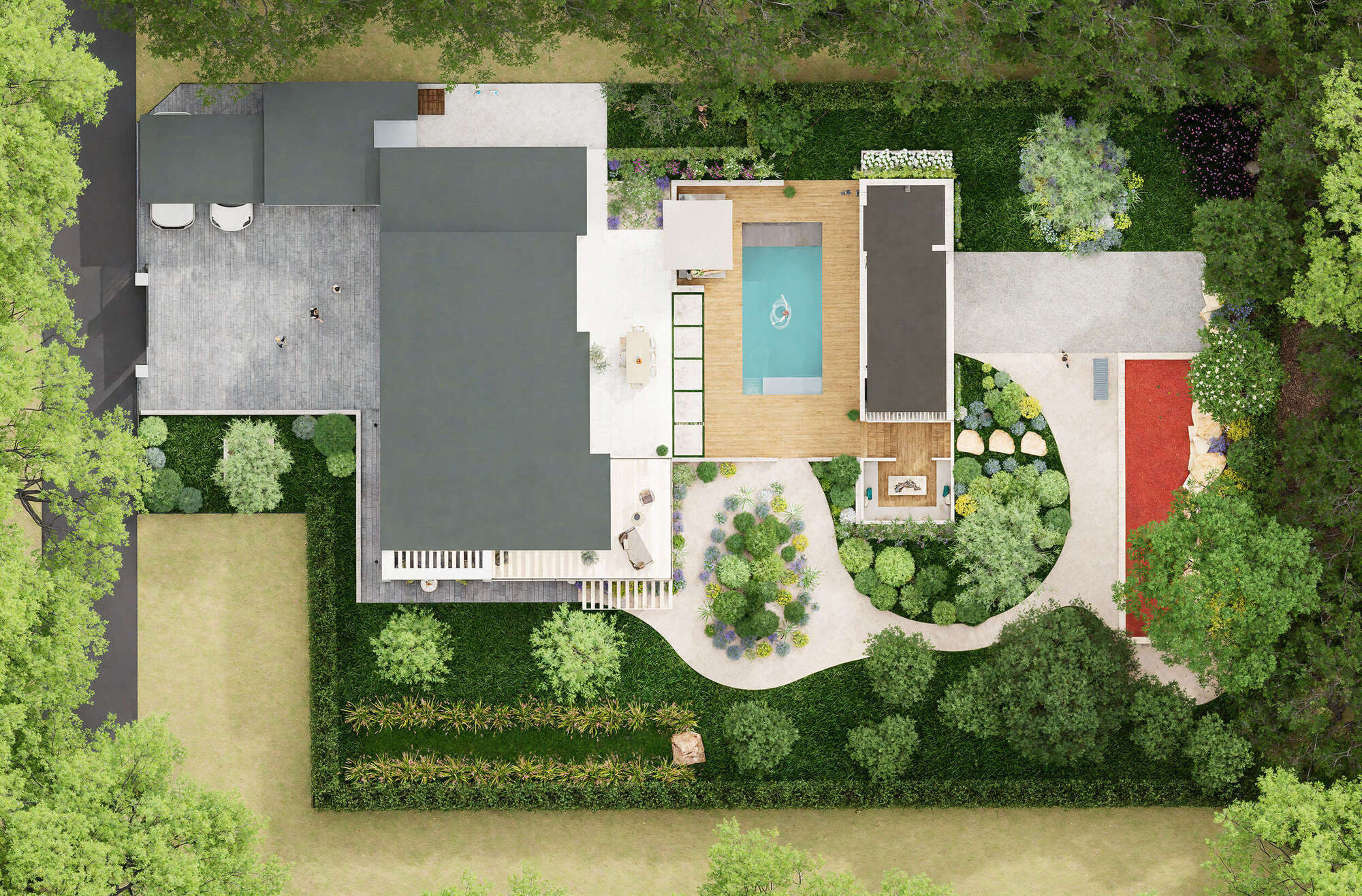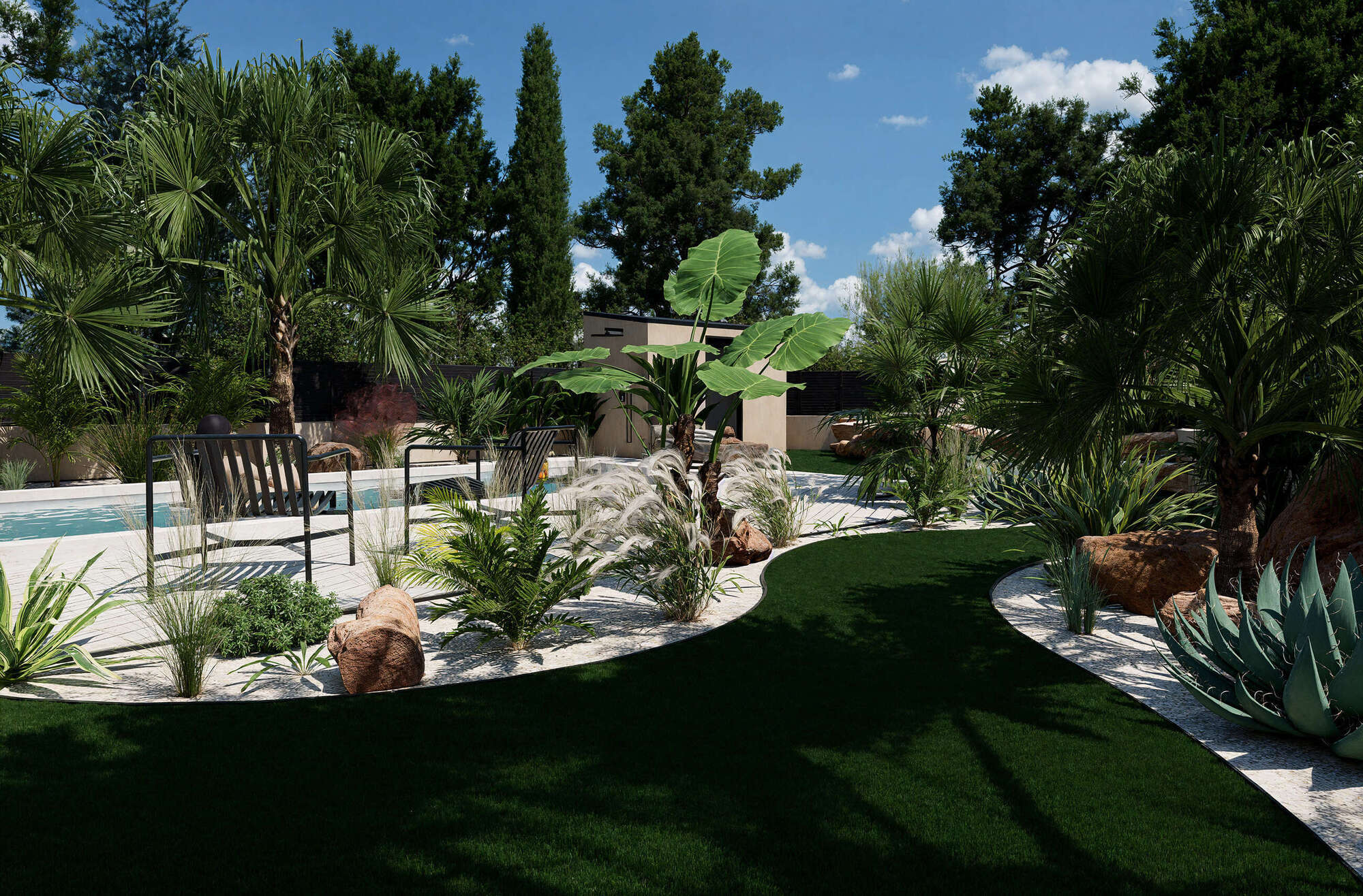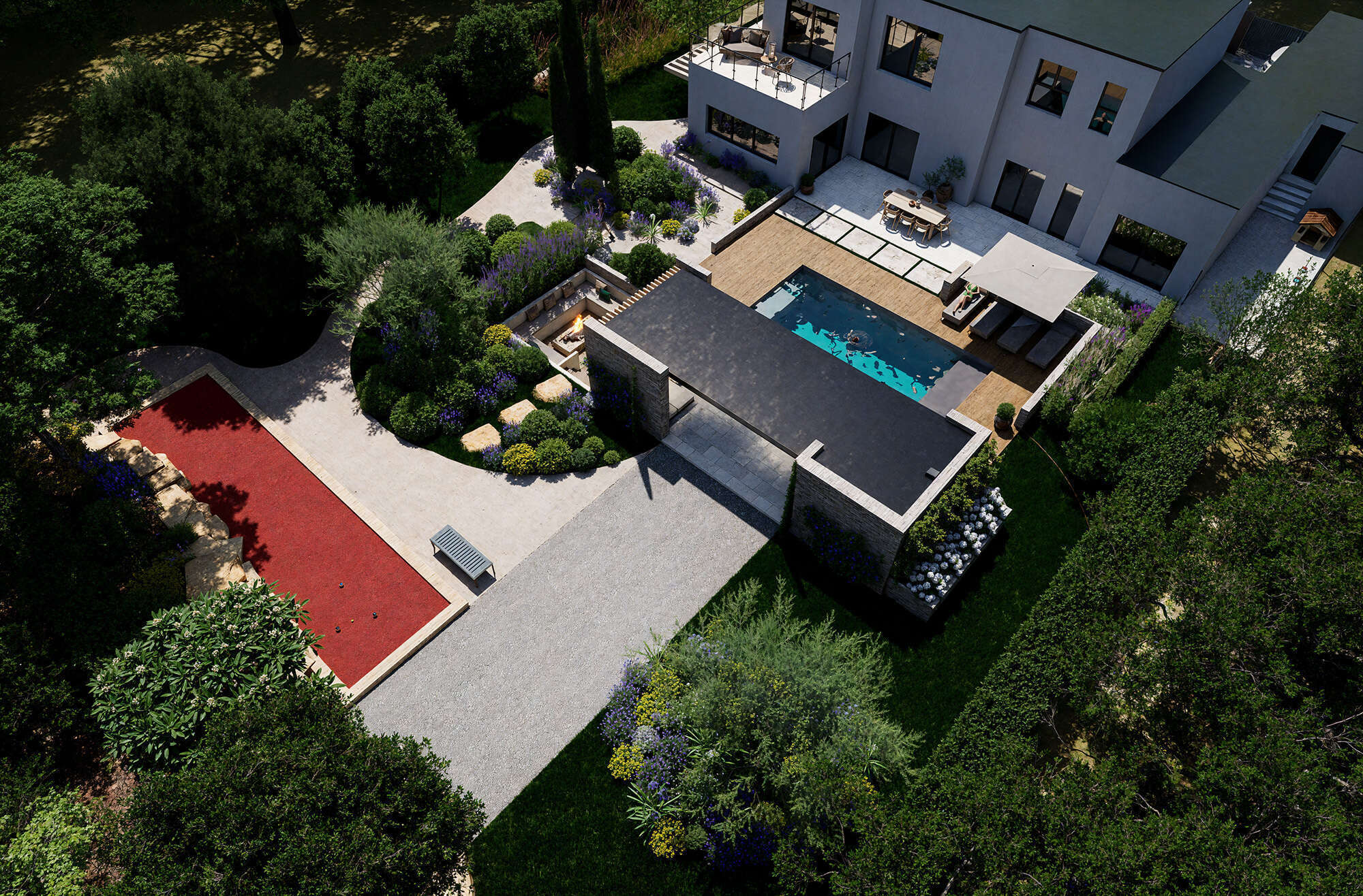 Voici un projet d'aménagement paysager pour une maison, espace pisicine, et coin jeu pour les enfants