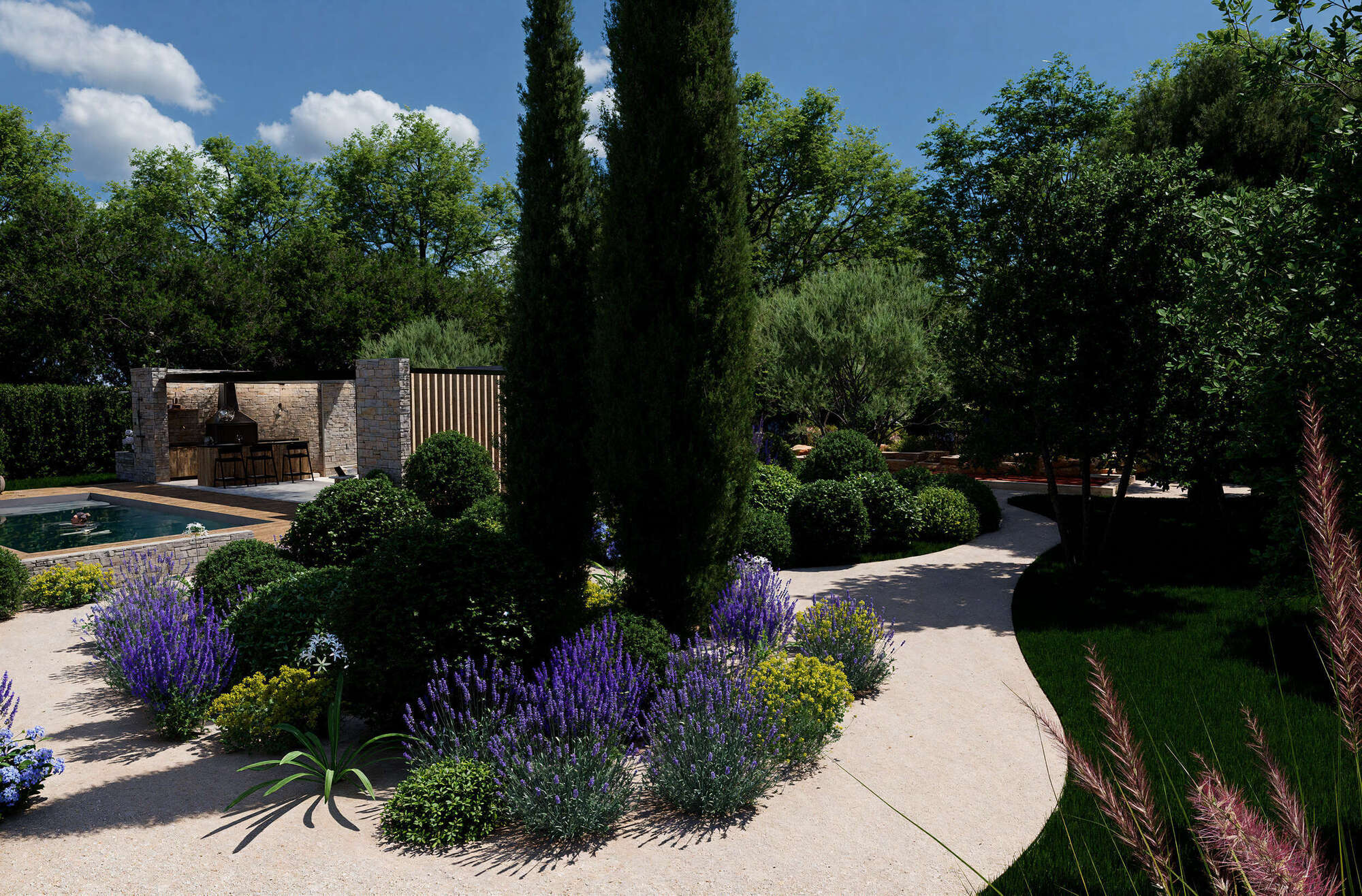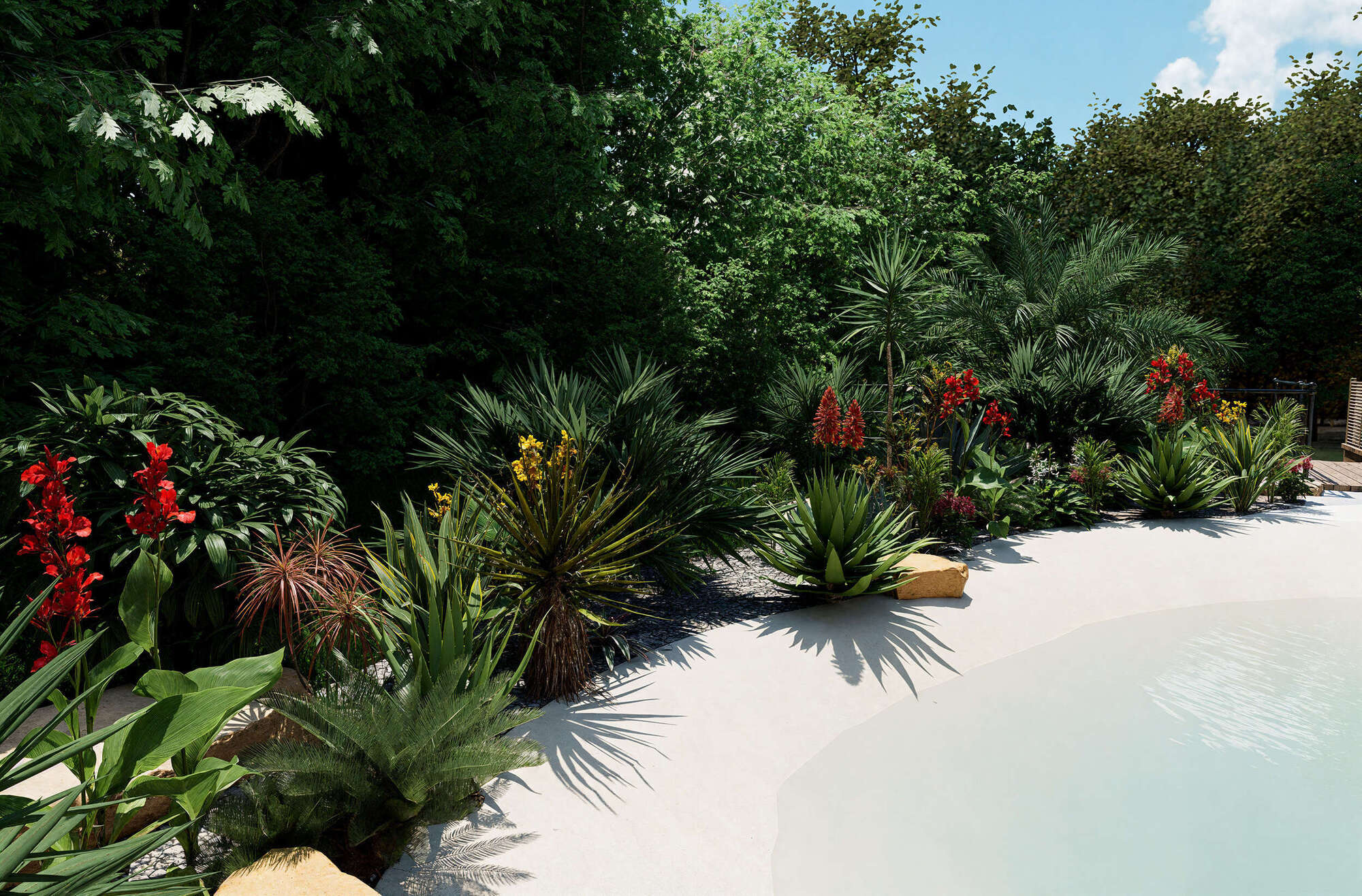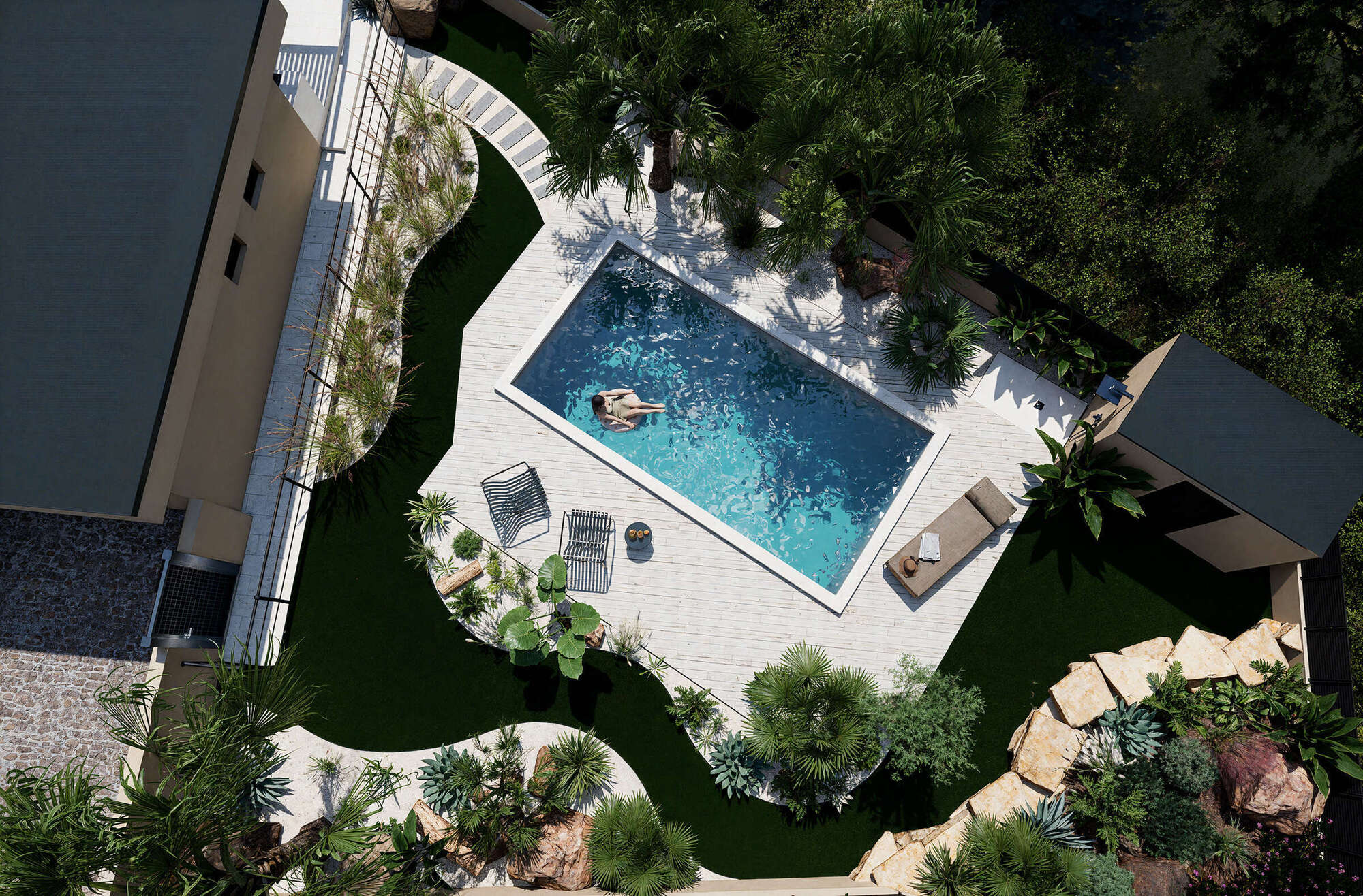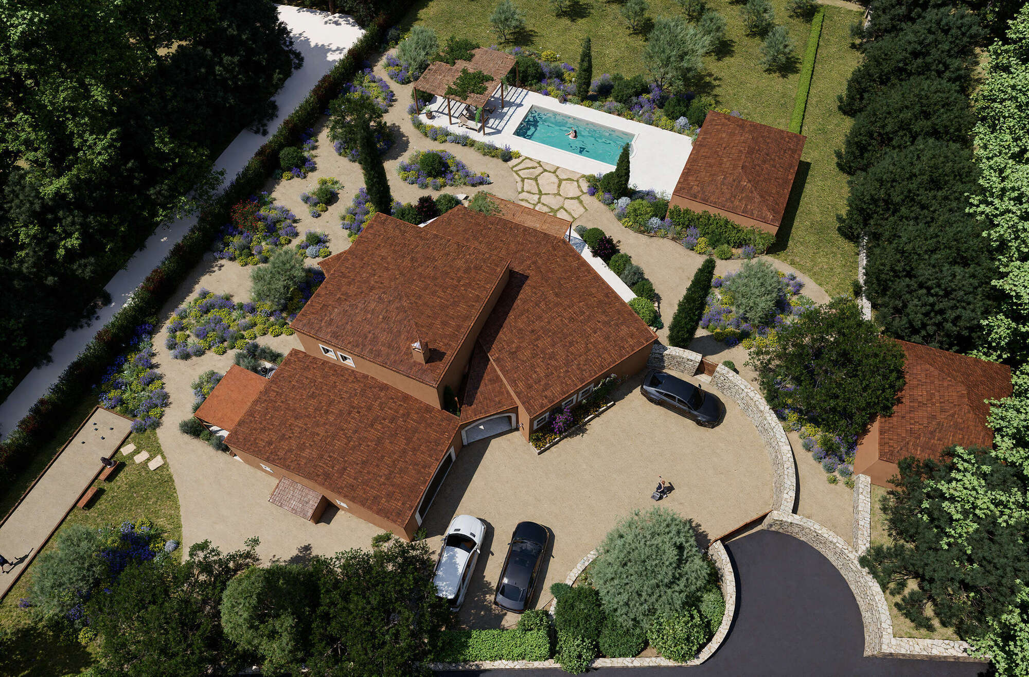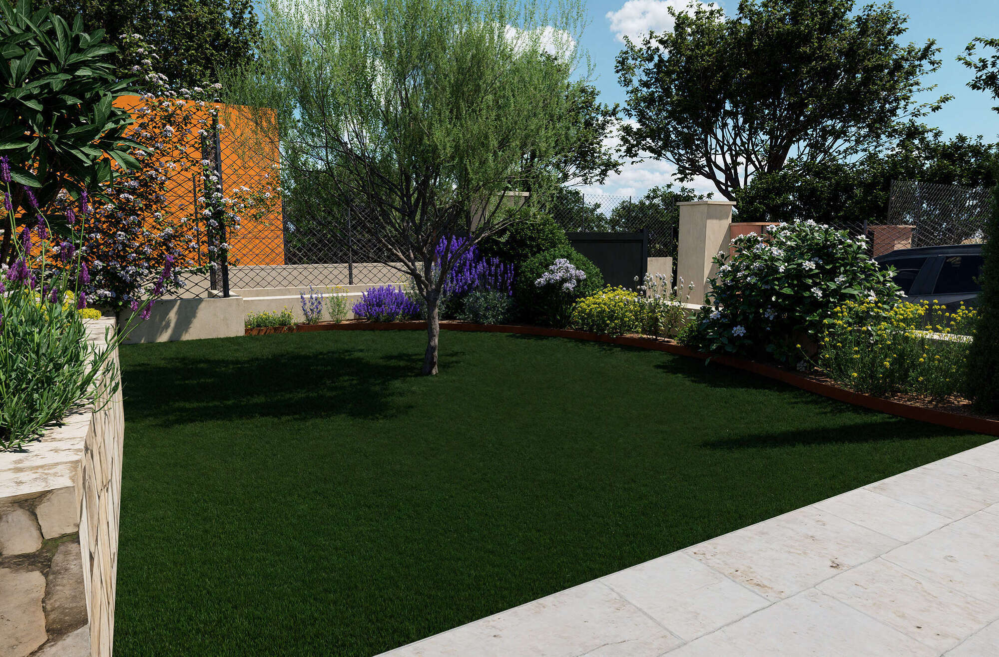 Voici un projet d'aménagement paysager pour une maison, espace pisicine, et coin jeu pour les enfants