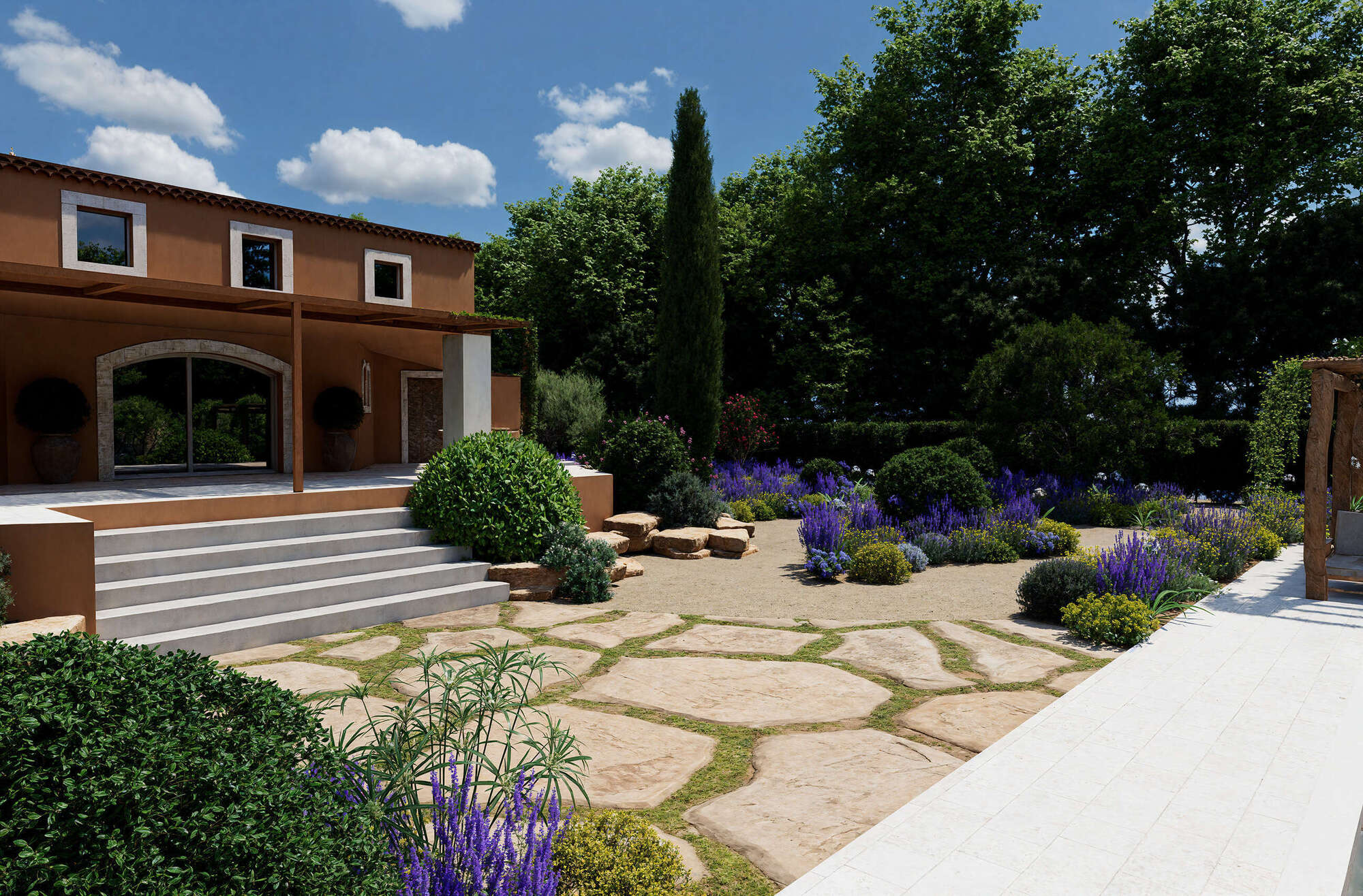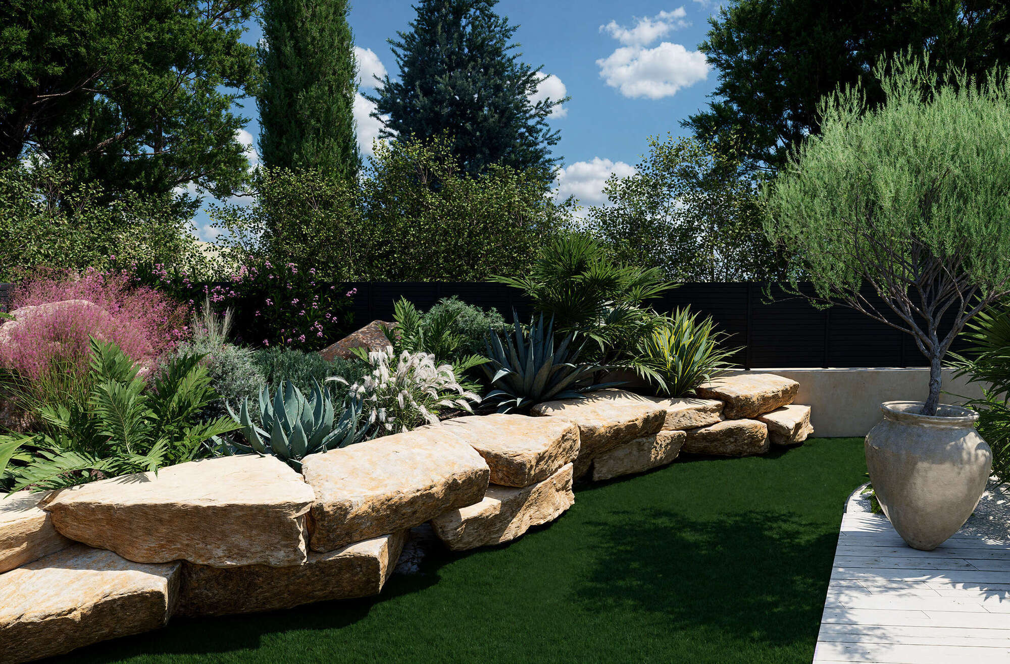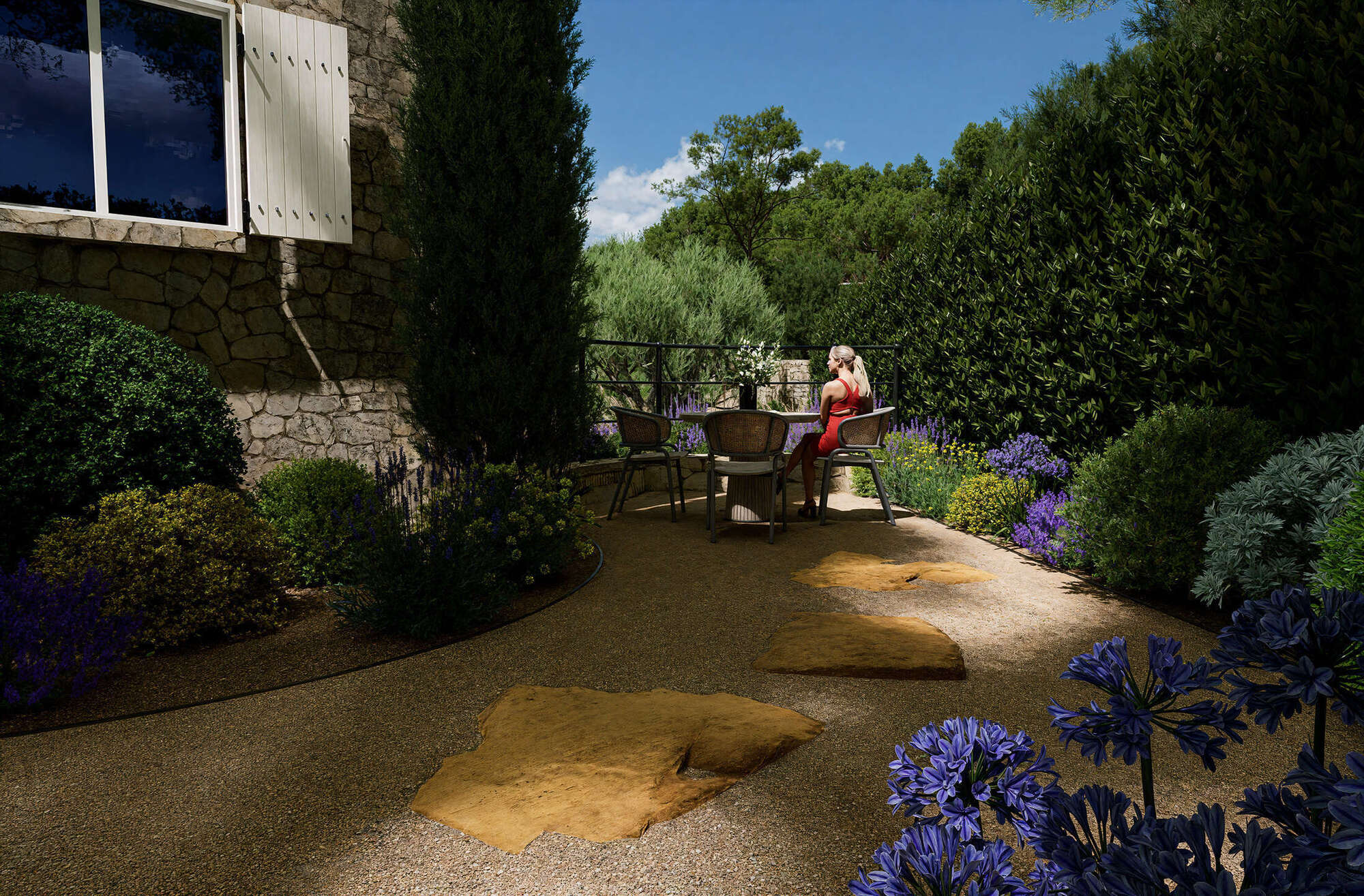 Aménagement extérieur d'une maison comprenant la création de restanques en pierre, d’un coin végétal et d’un espace repas avec table.