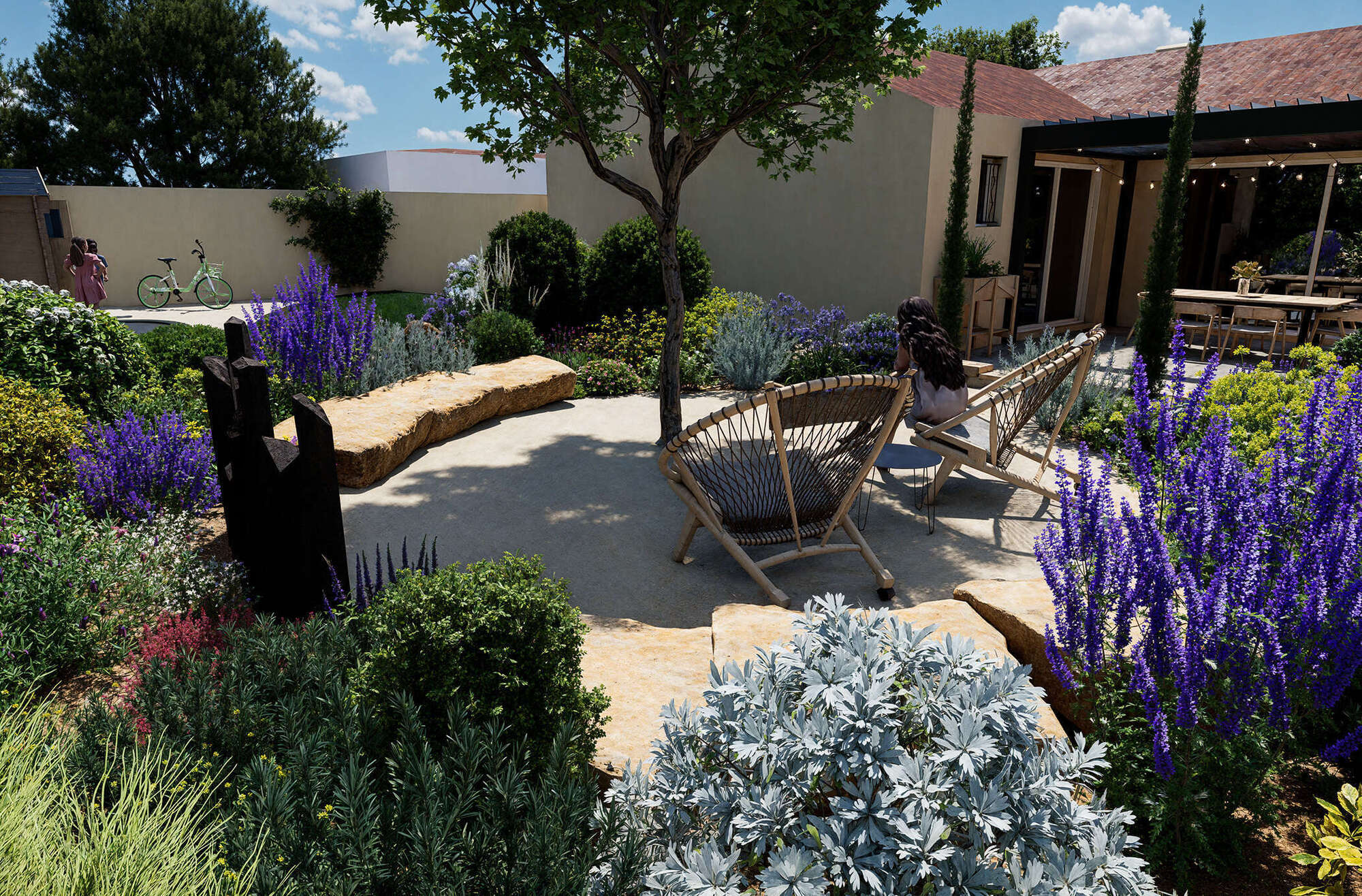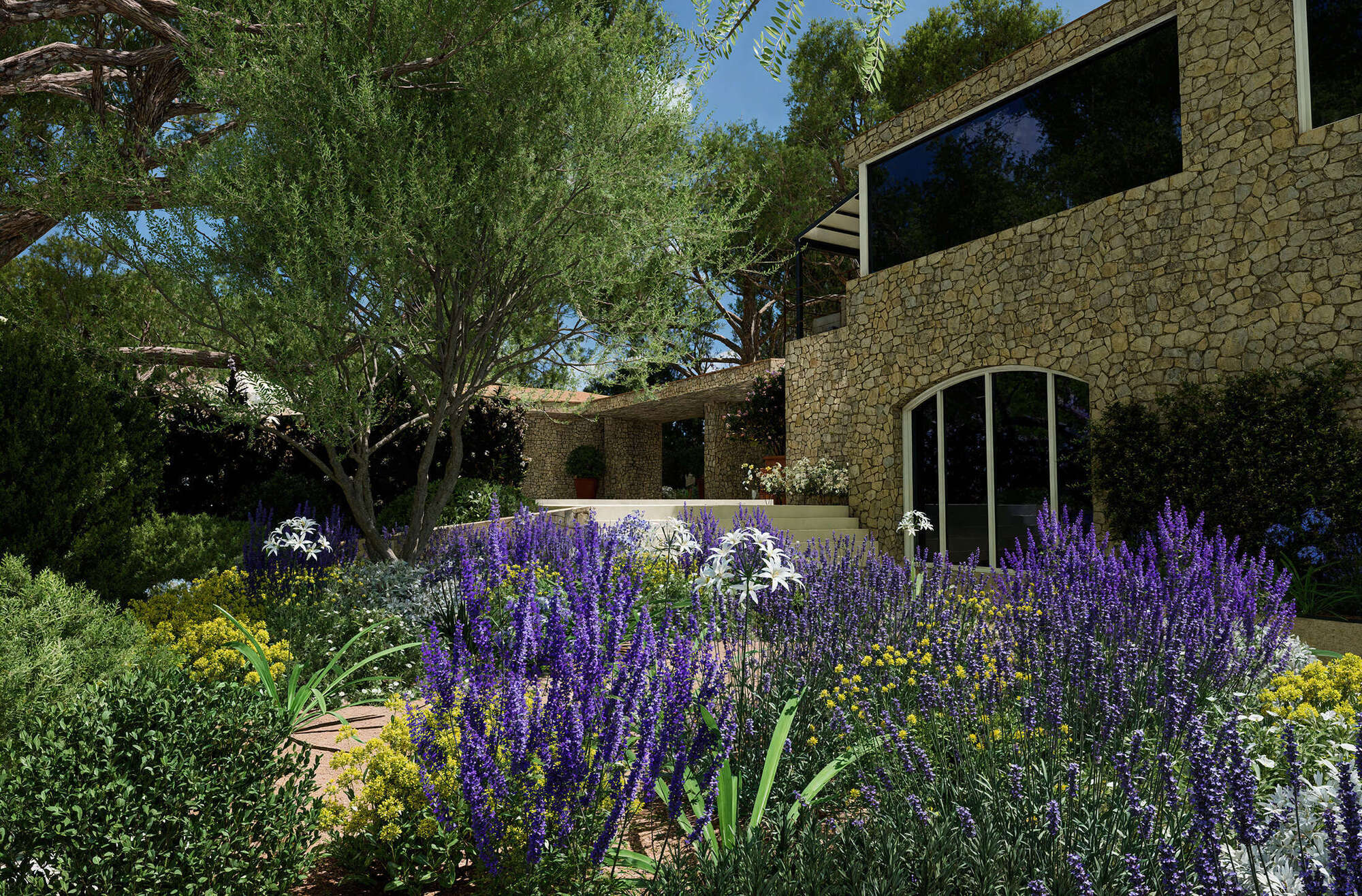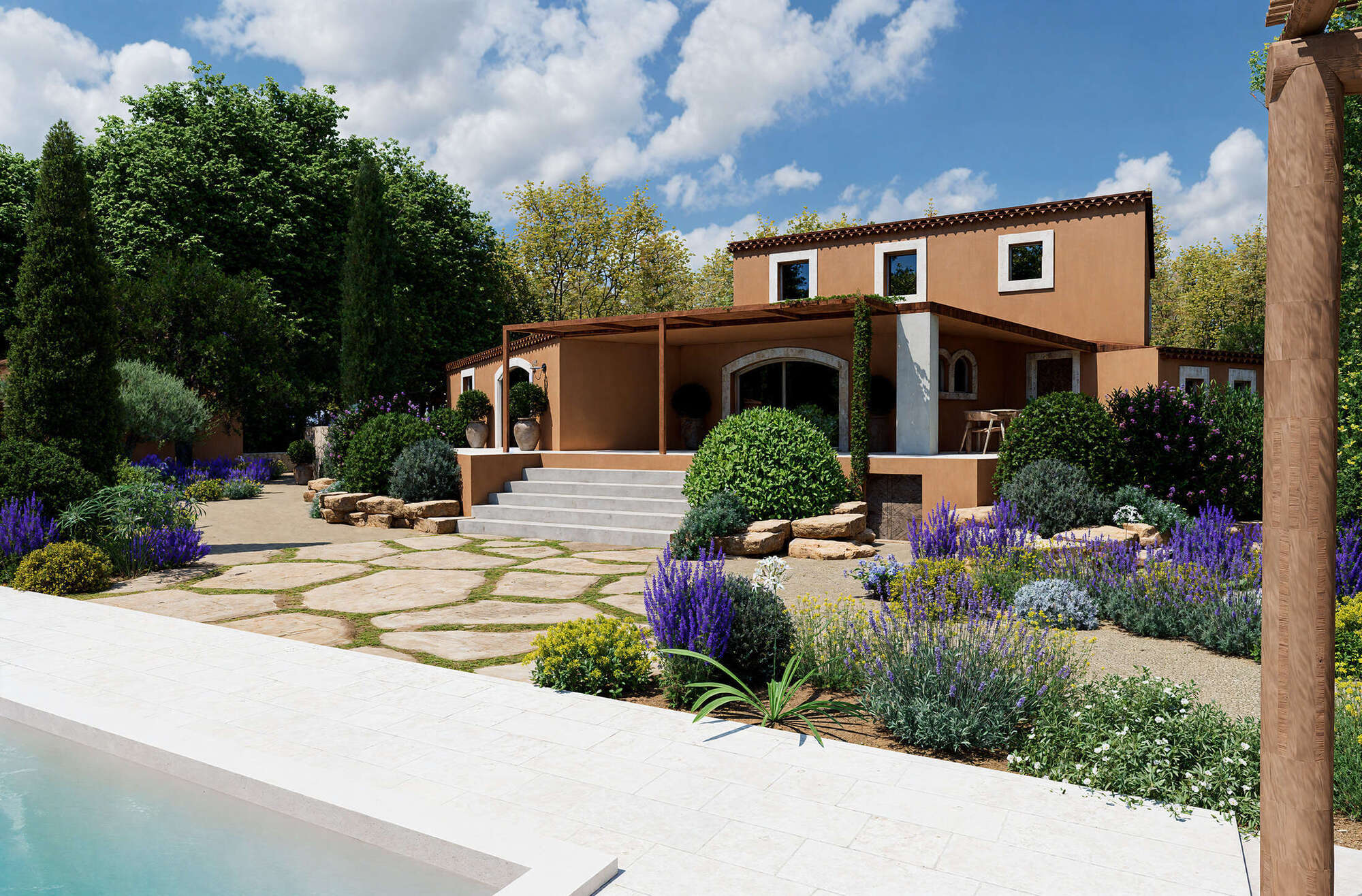 Aménagement extérieur d'une maison comprenant la création de restanques en pierre, d’un coin végétal et d’un espace repas avec table.