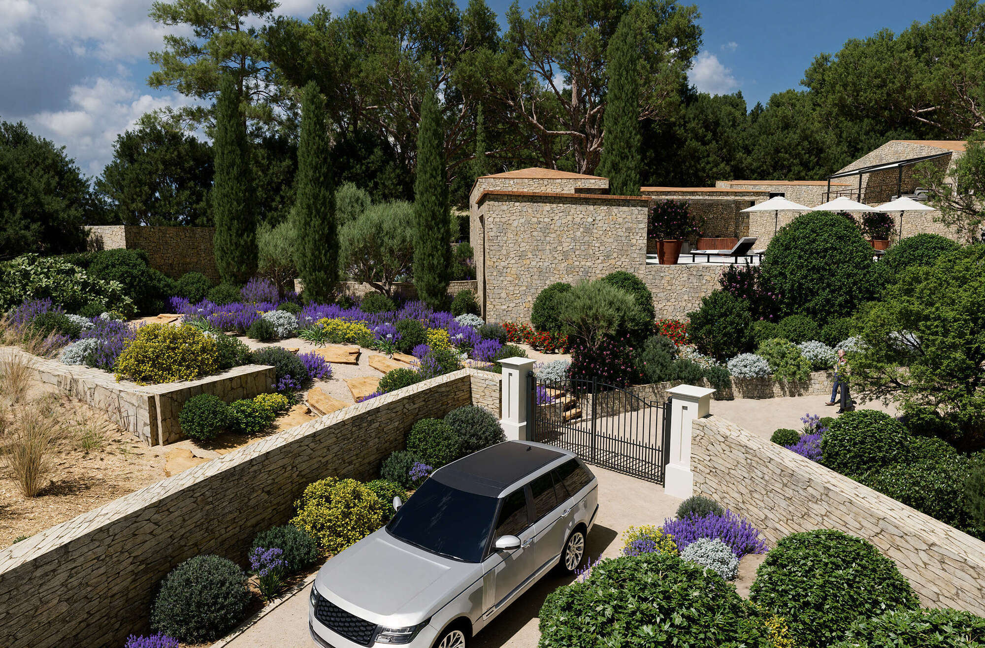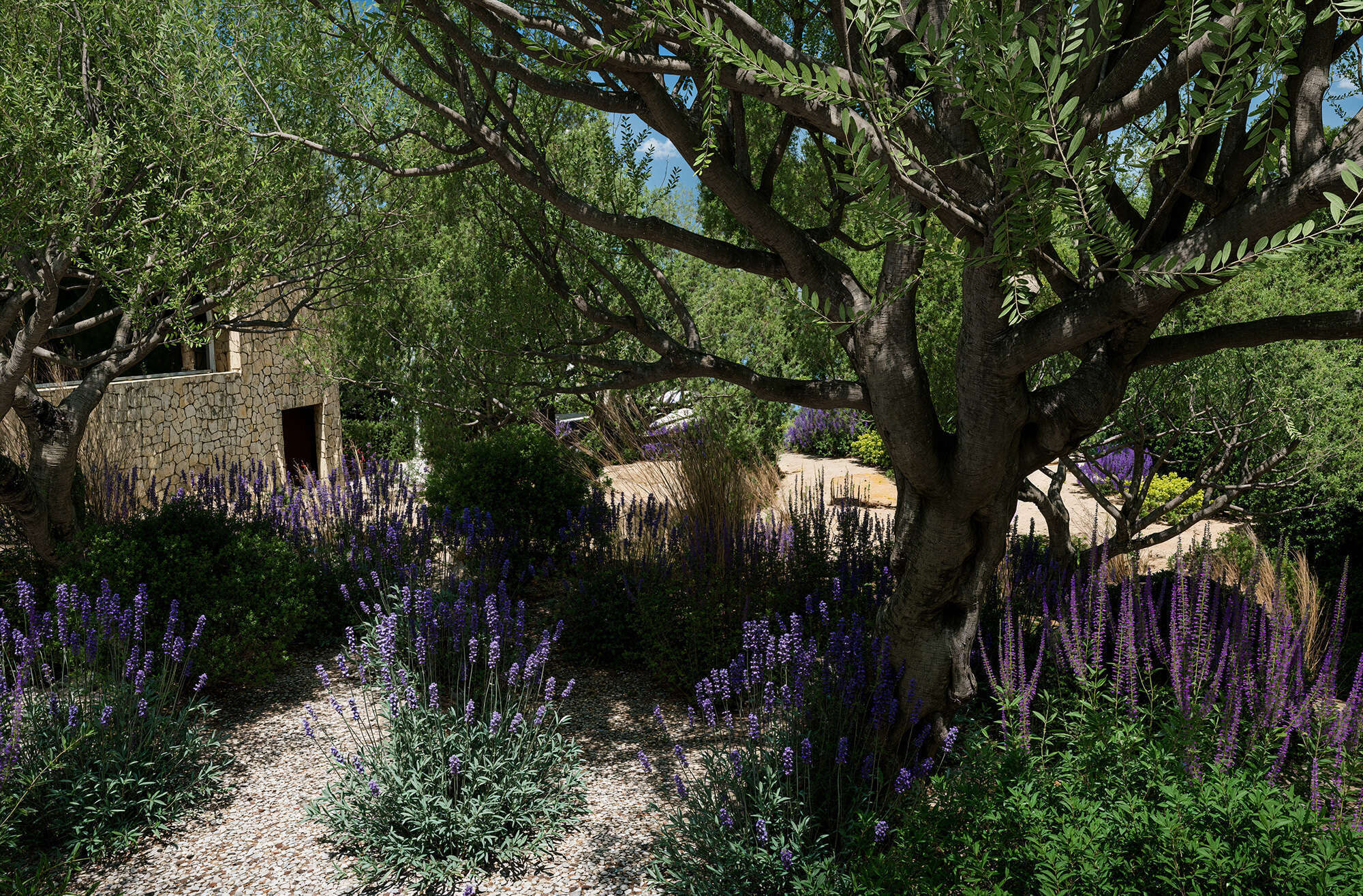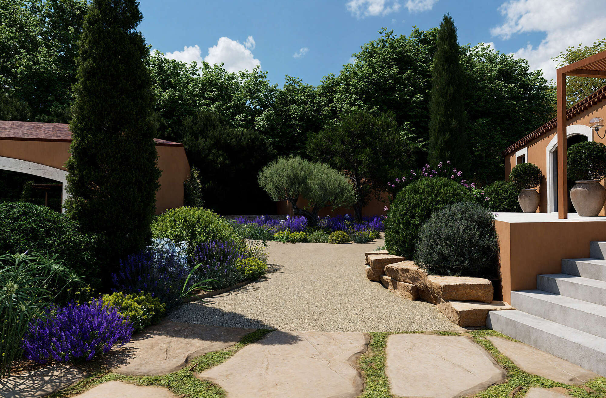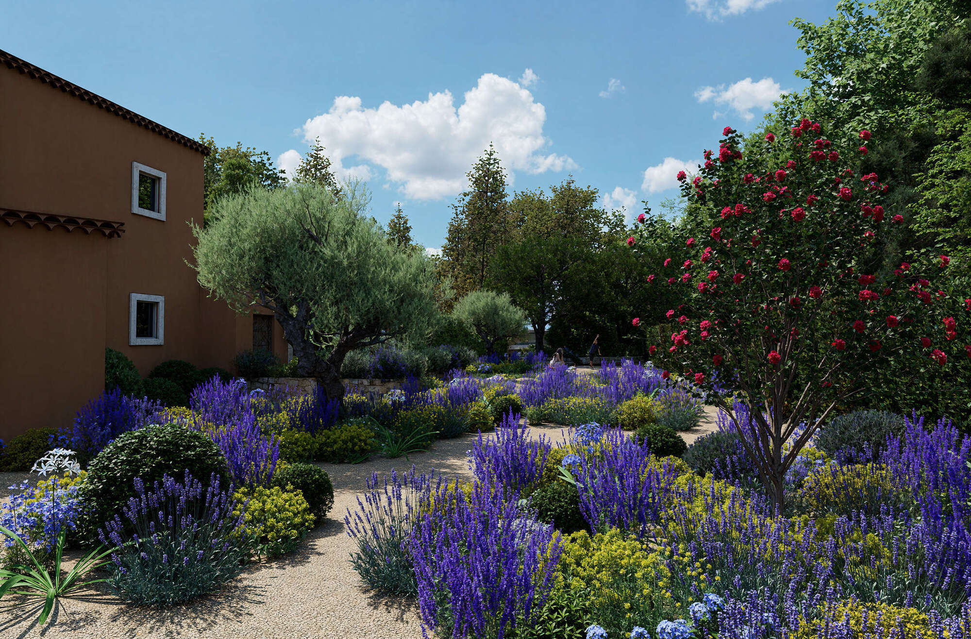 Enrochement, coin potager, champ de lavande et parking. Un cadre naturel, fonctionnel et apaisant.