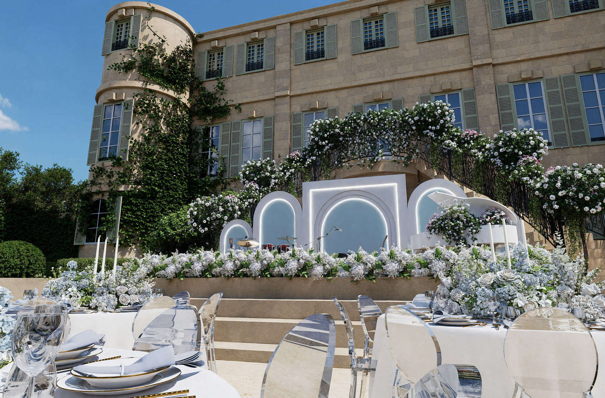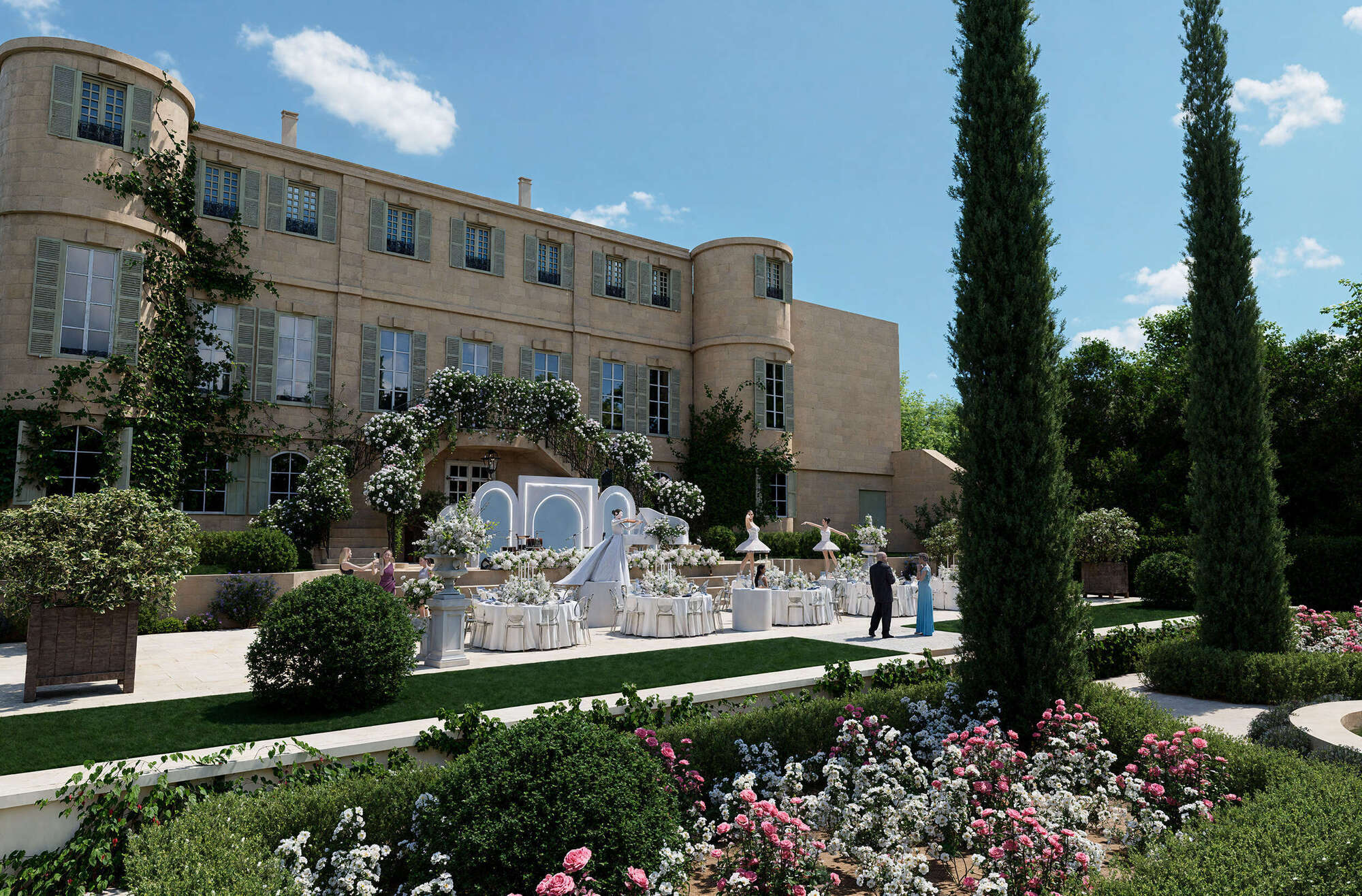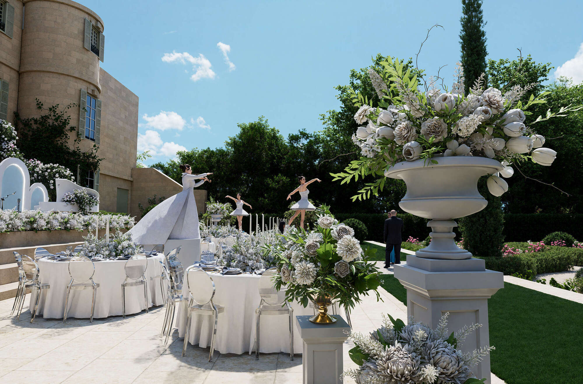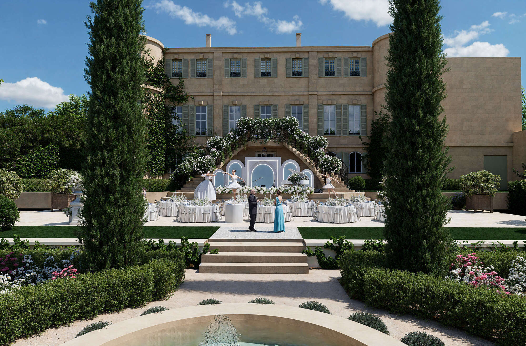 Modélisation d’un mariage au Château d’Estoublon, mêlant l’élégance du lieu à une ambiance féérique. La scène met en valeur un groupe musical en live accompagné de danseuses classiques, créant une atmosphère raffinée et poétique au cœur du domaine