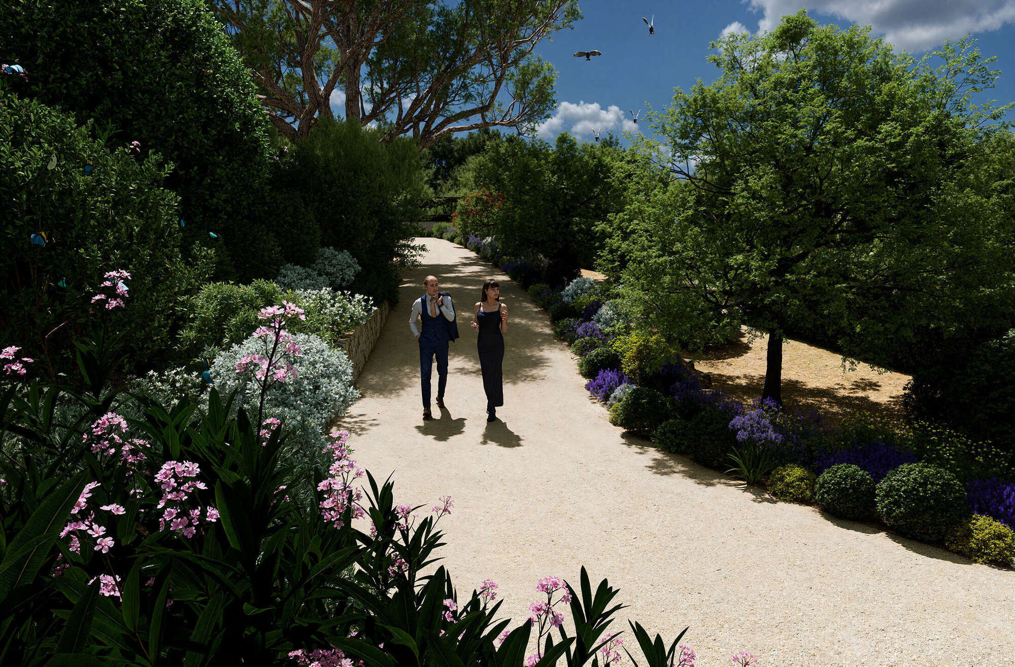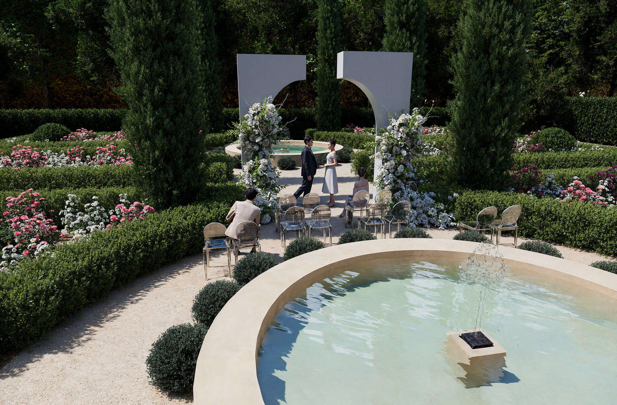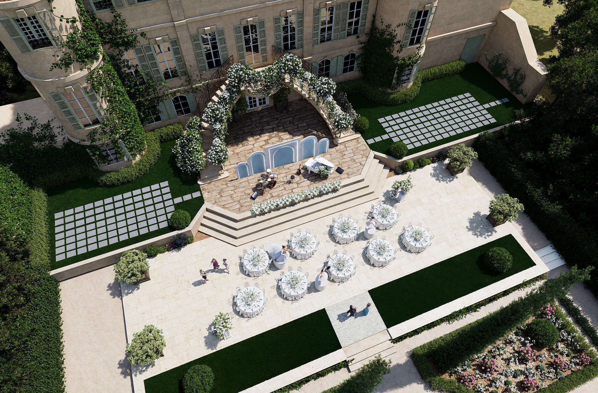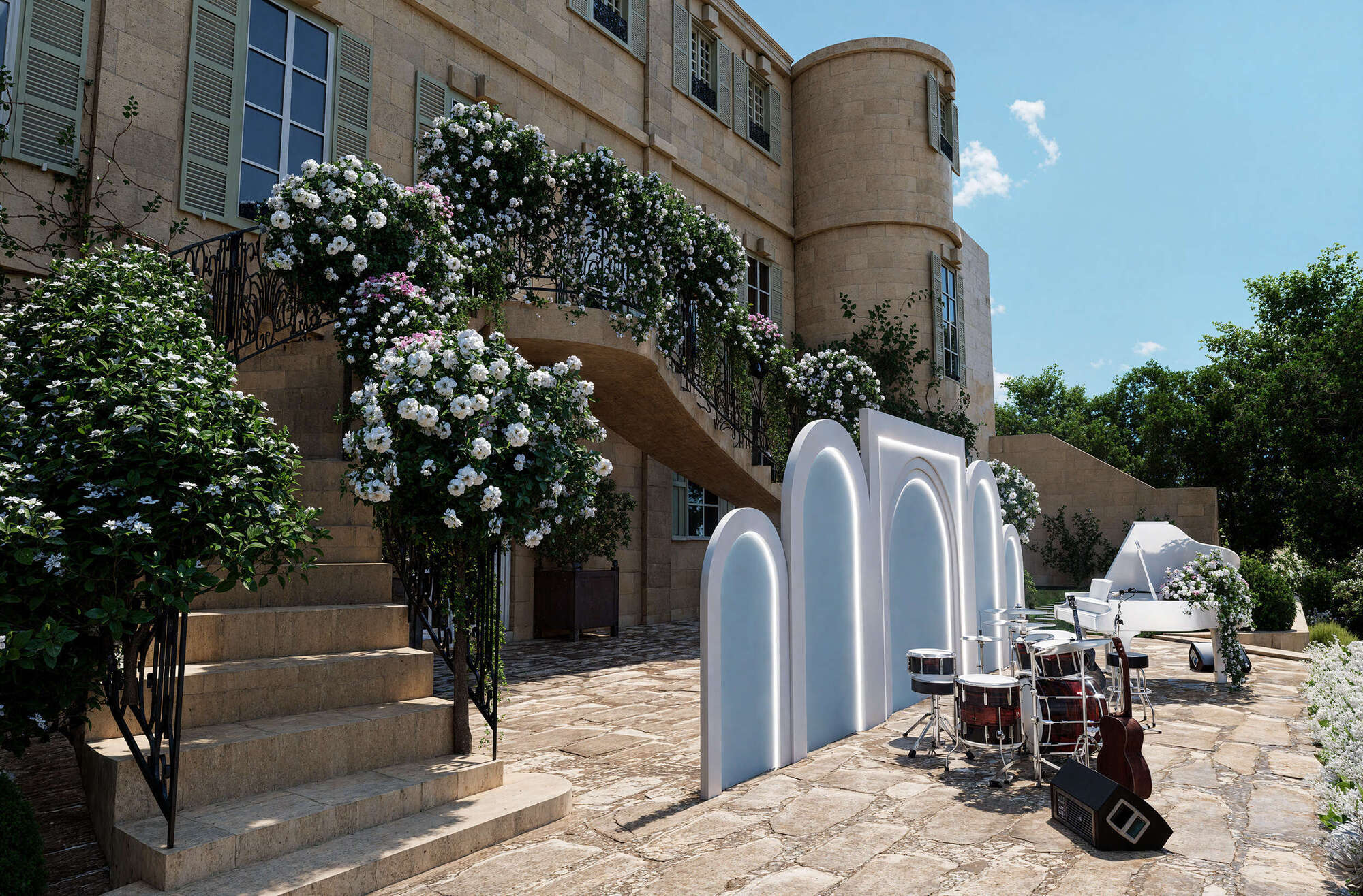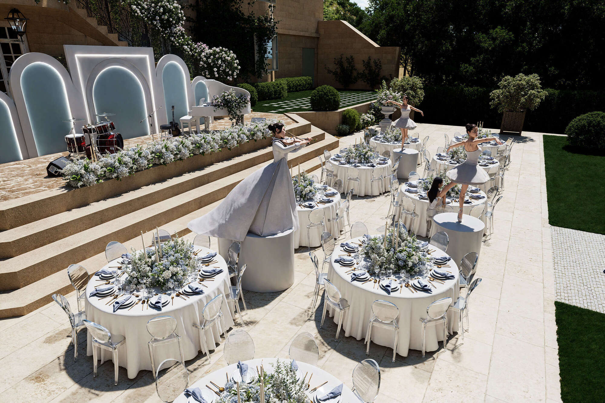 Modélisation d’un mariage au Château d’Estoublon, mêlant l’élégance du lieu à une ambiance féérique. La scène met en valeur un groupe musical en live accompagné de danseuses classiques, créant une atmosphère raffinée et poétique au cœur du domaine