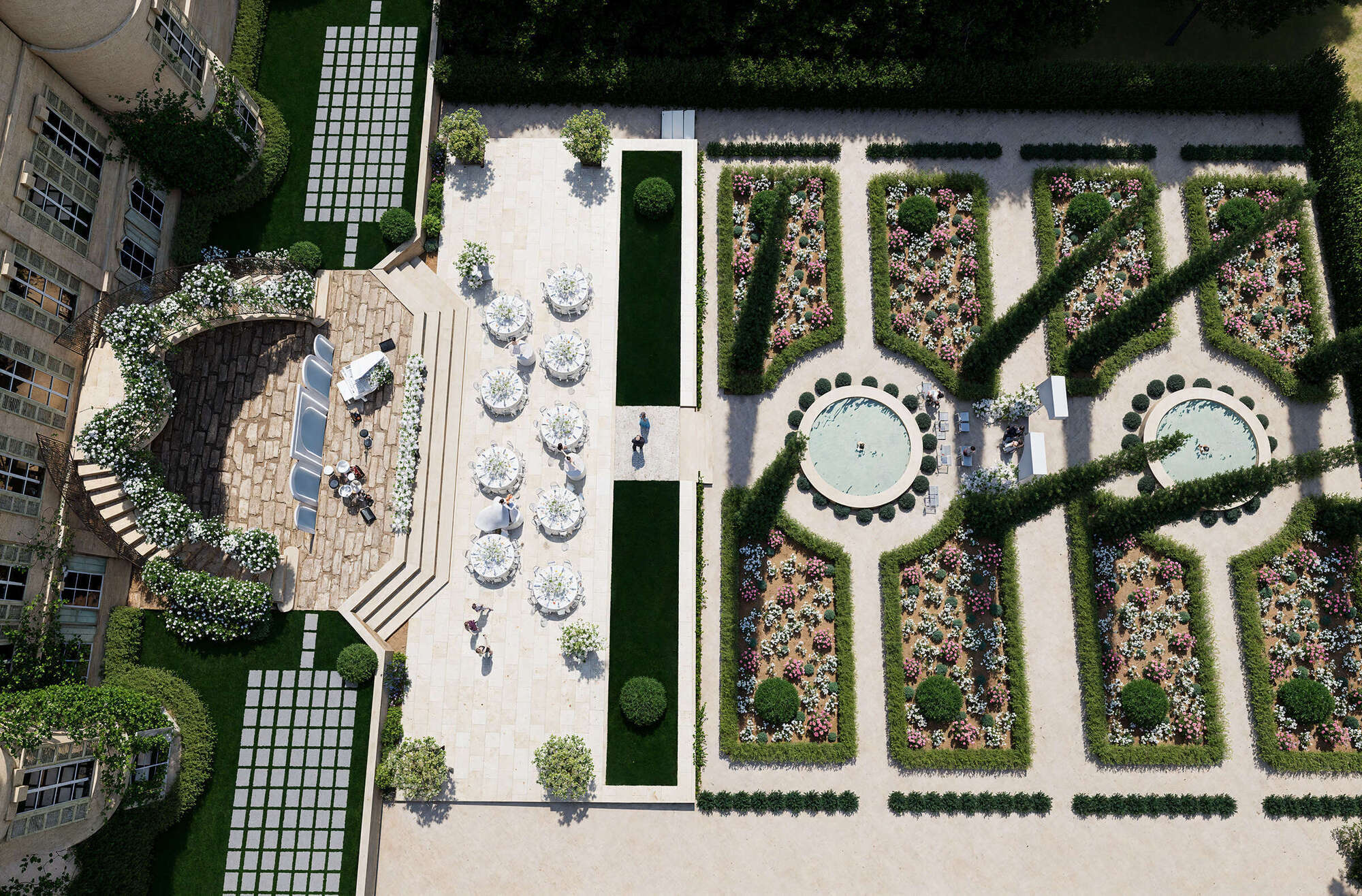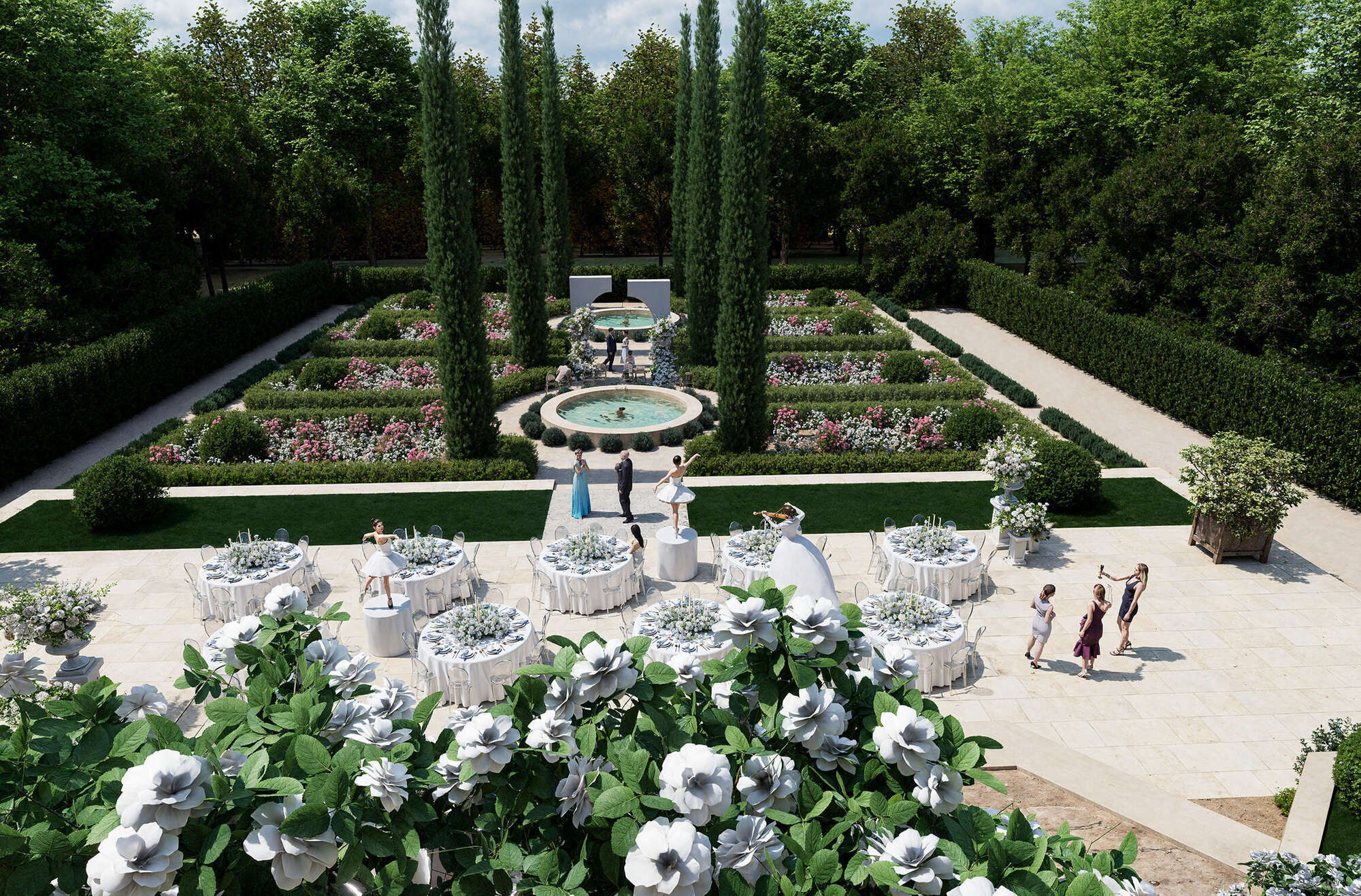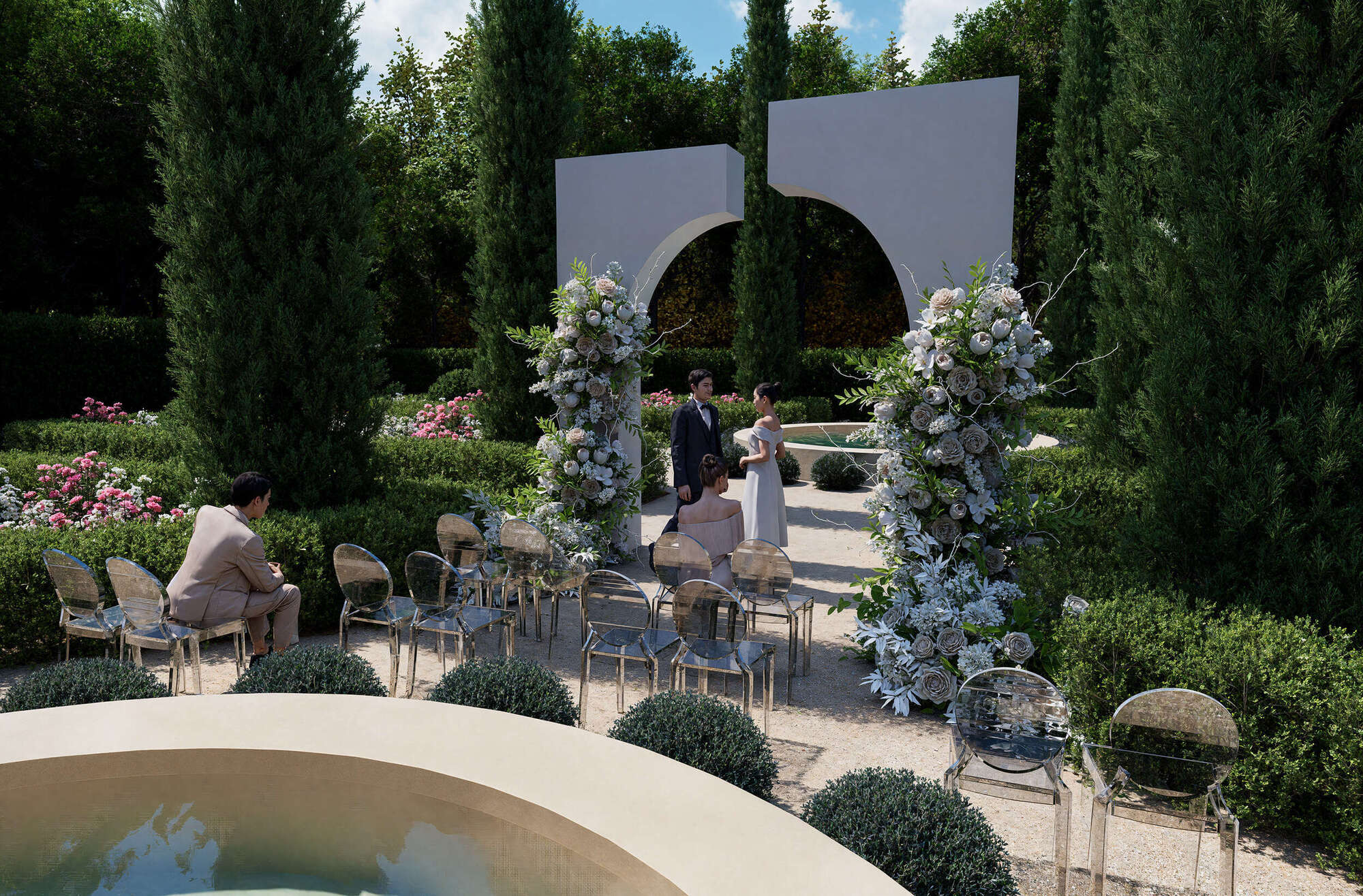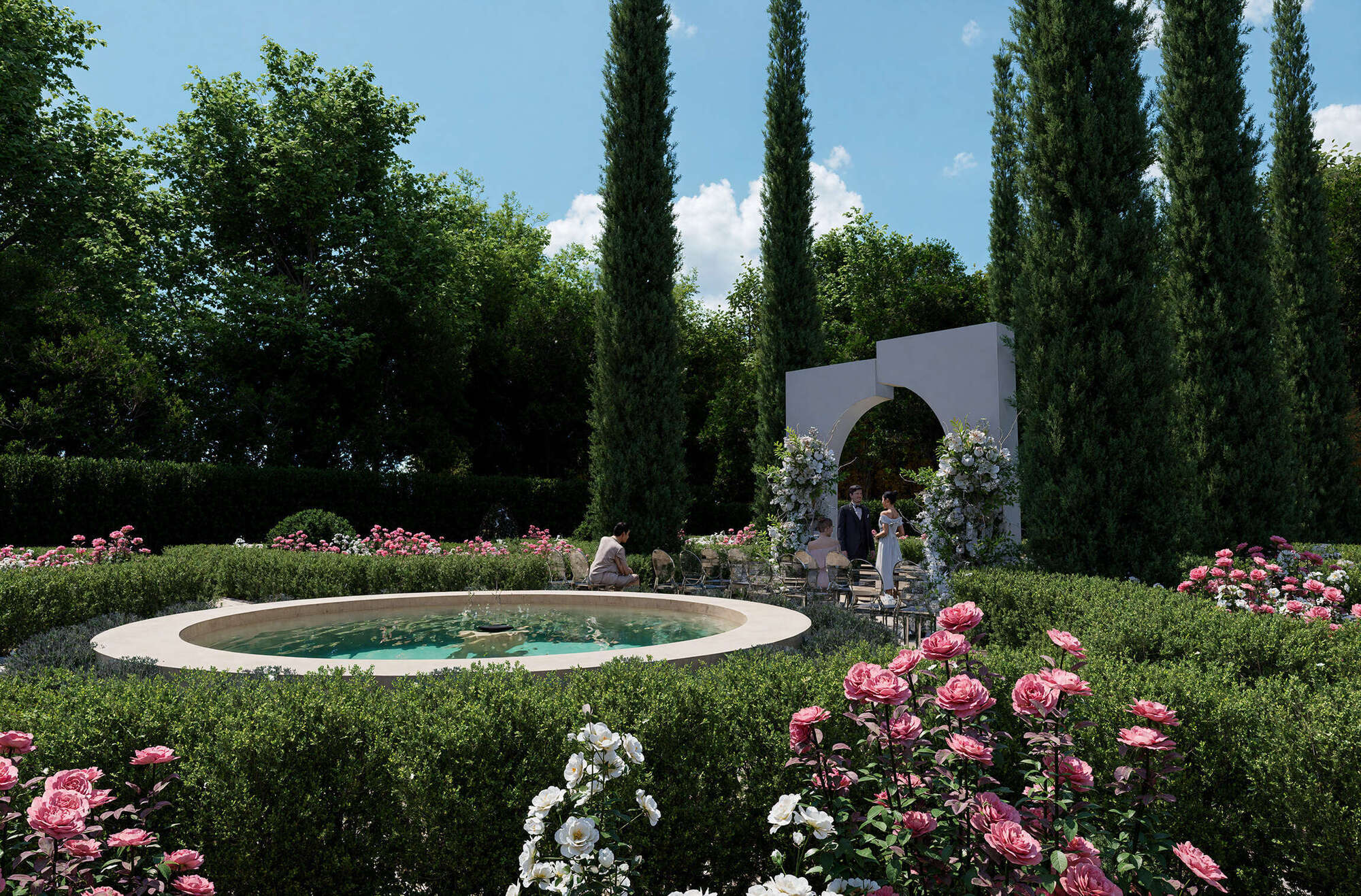 Modélisation d’un mariage au Château d’Estoublon, mêlant l’élégance du lieu à une ambiance féérique. La scène met en valeur un groupe musical en live accompagné de danseuses classiques, créant une atmosphère raffinée et poétique au cœur du domaine