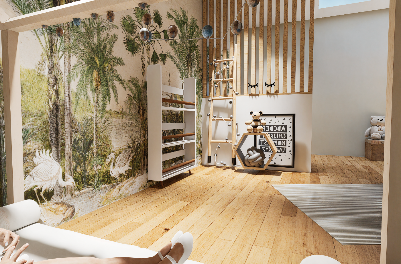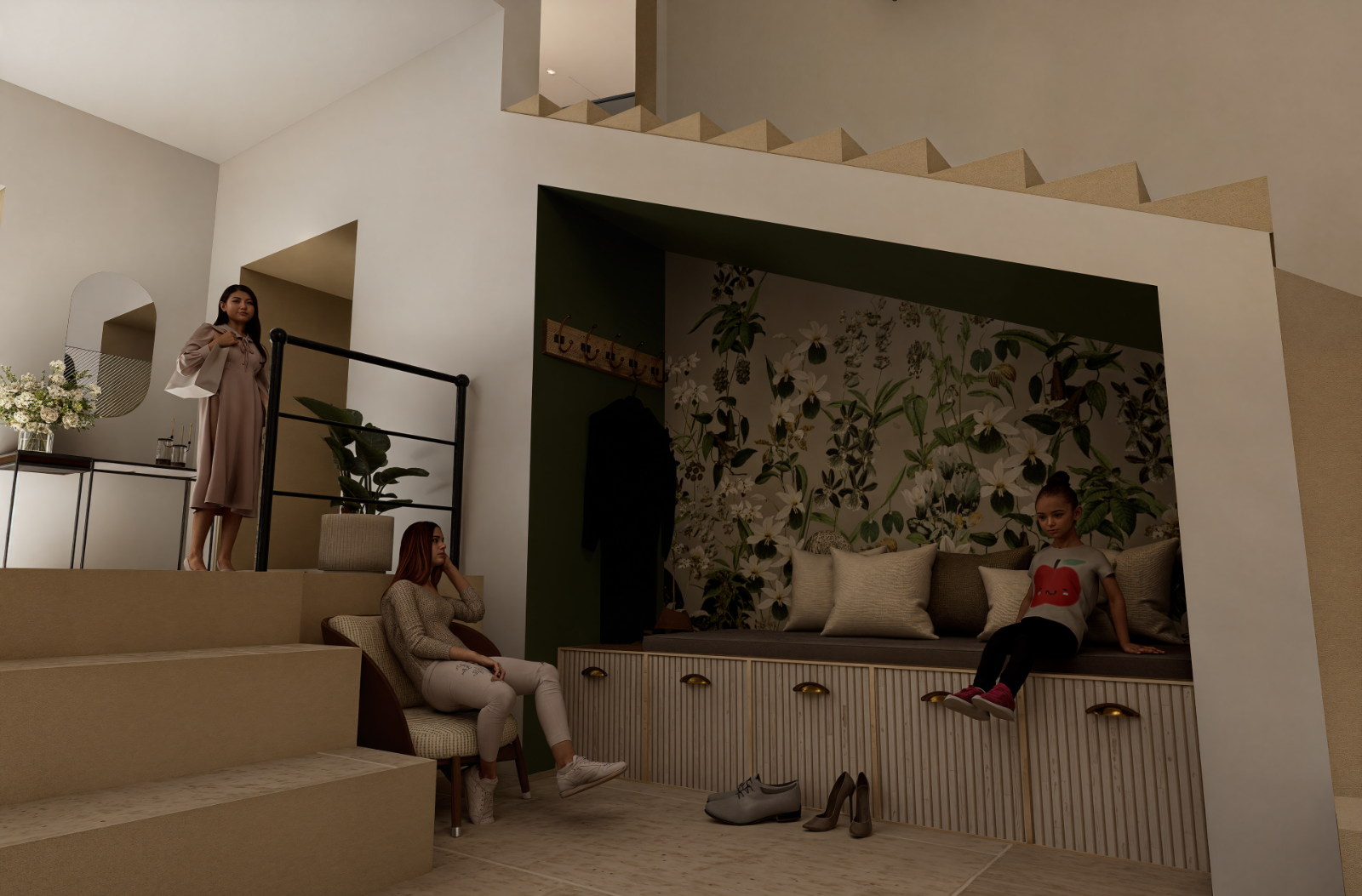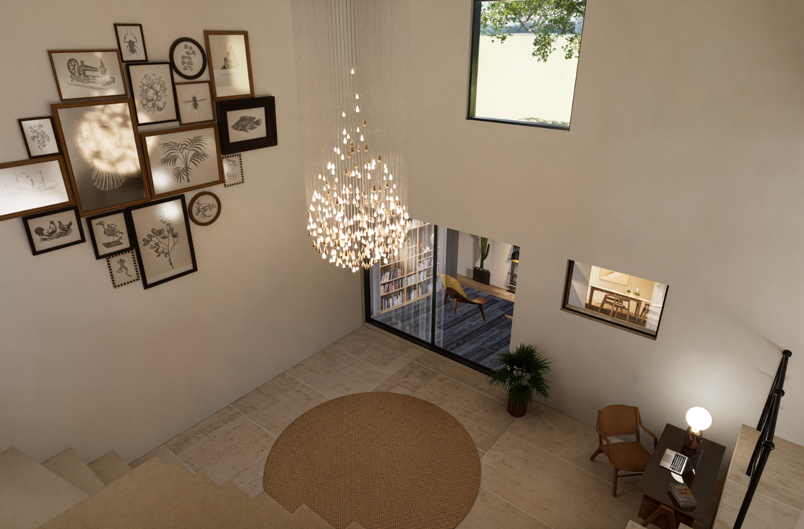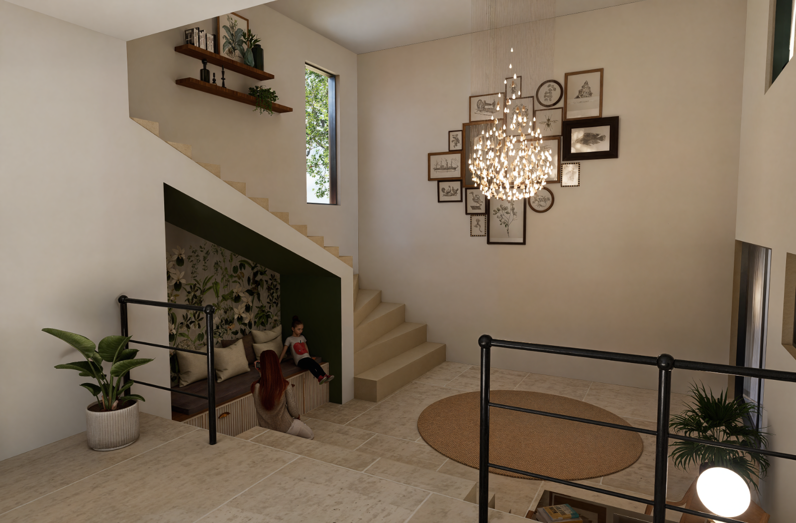 Mise en situation des futurs travaux pour l’aménagement intérieur d’un étage, permettant aux particuliers de se projeter dans les volumes, les circulations et les ambiances avant le démarrage du chantier