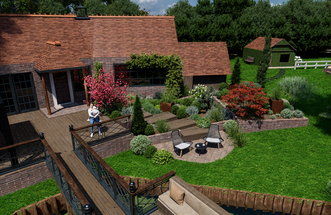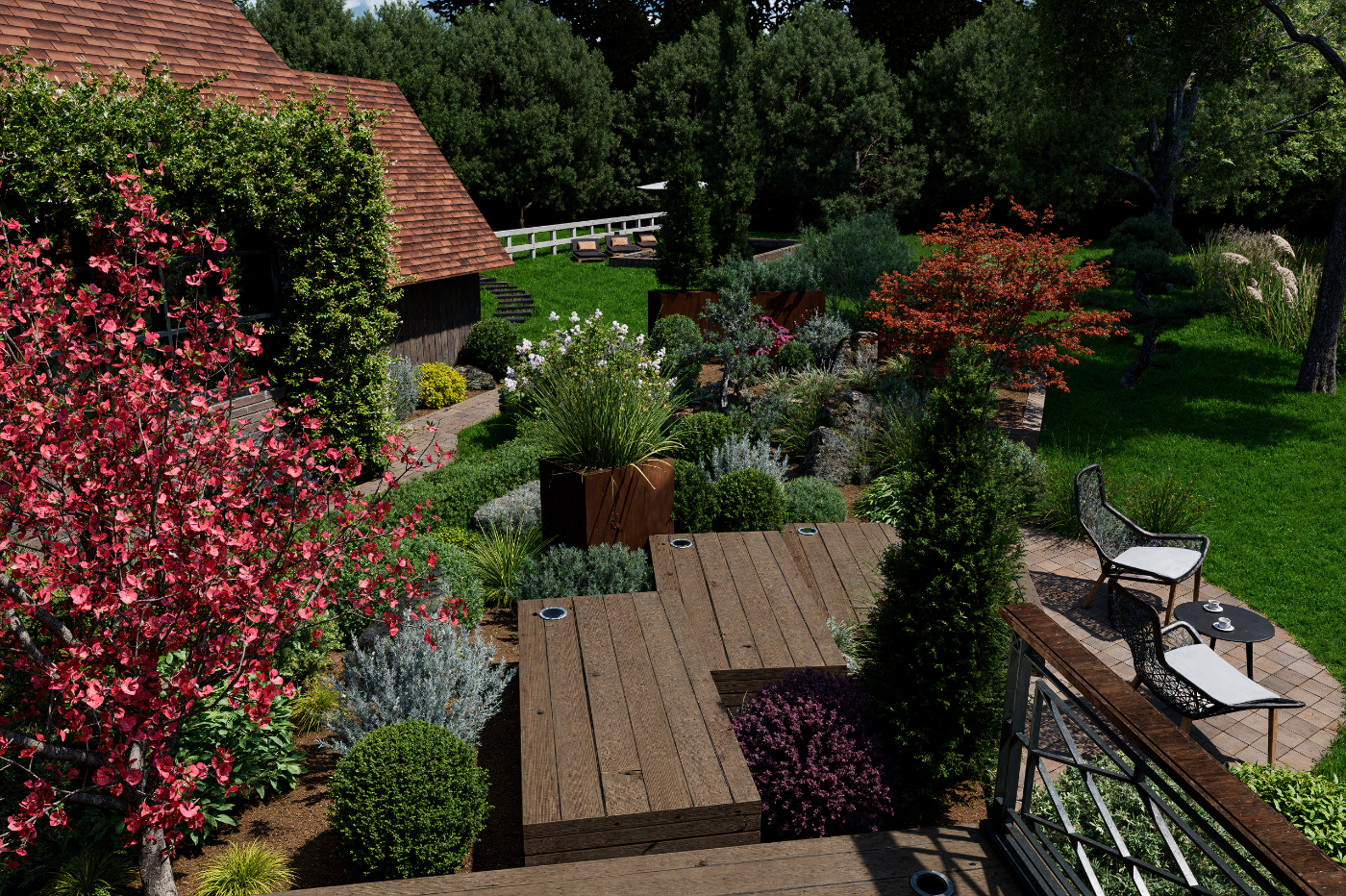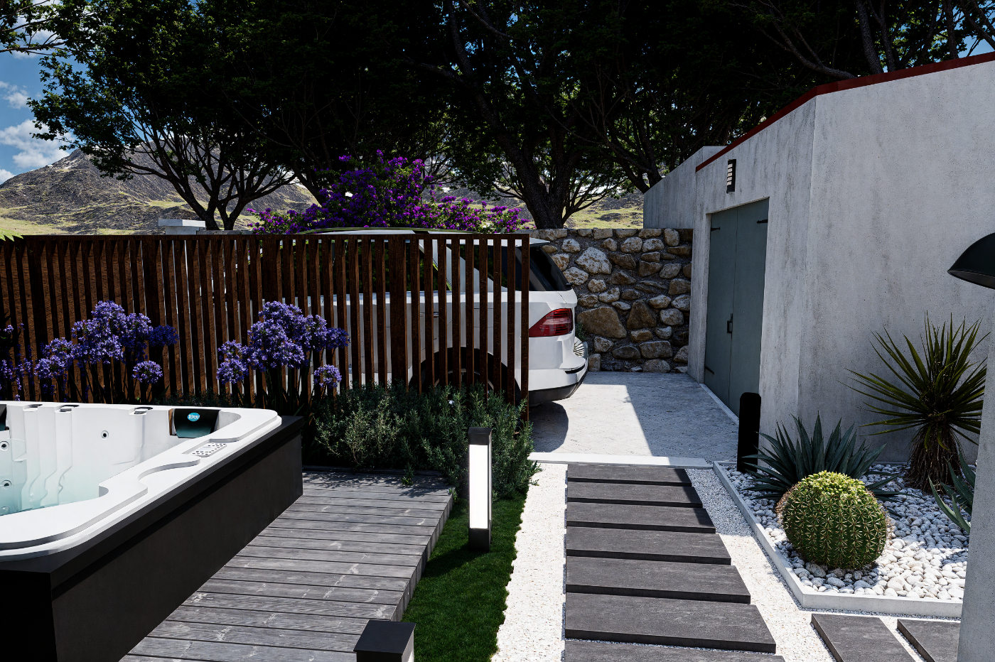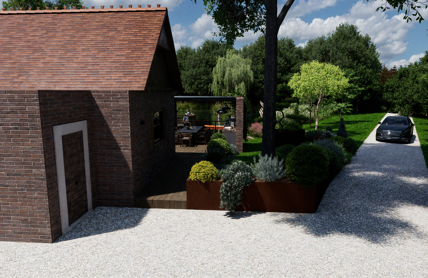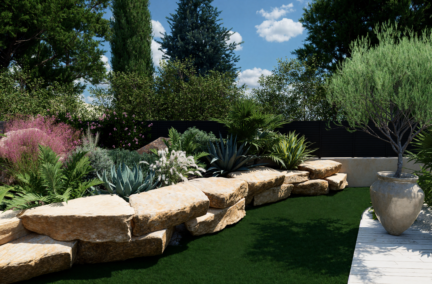 Aménagement extérieur complet et harmonieux.