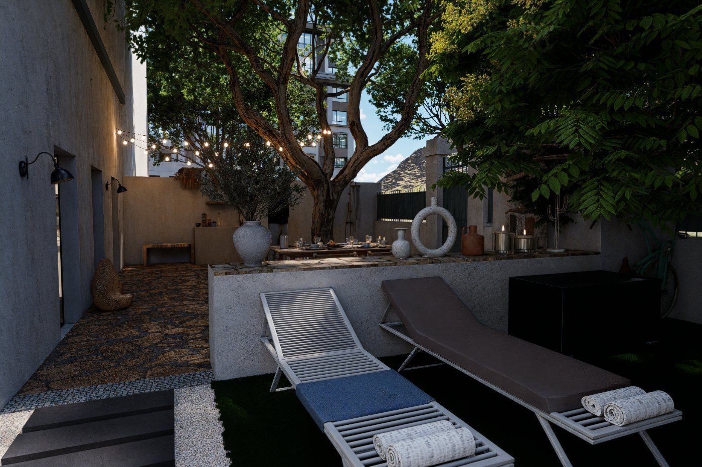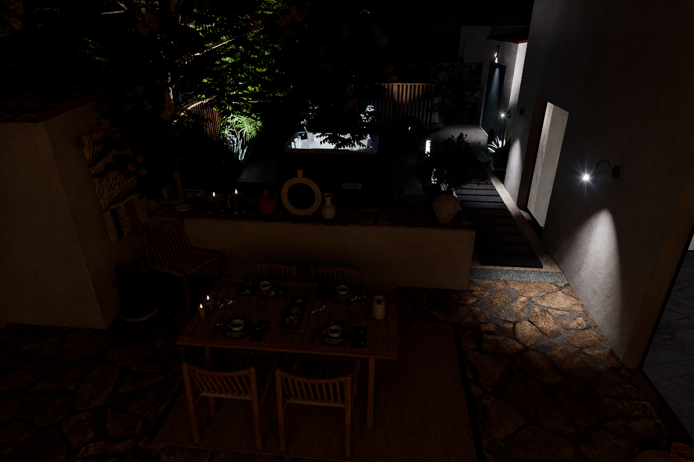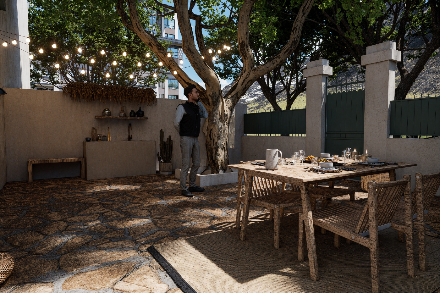 Pierres, végétation et espace repas intégrés.