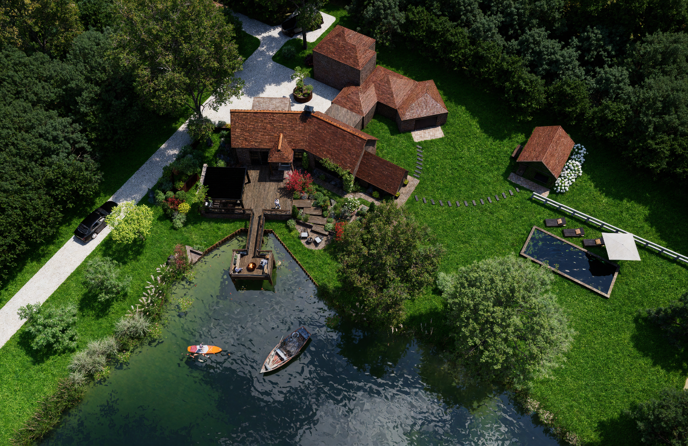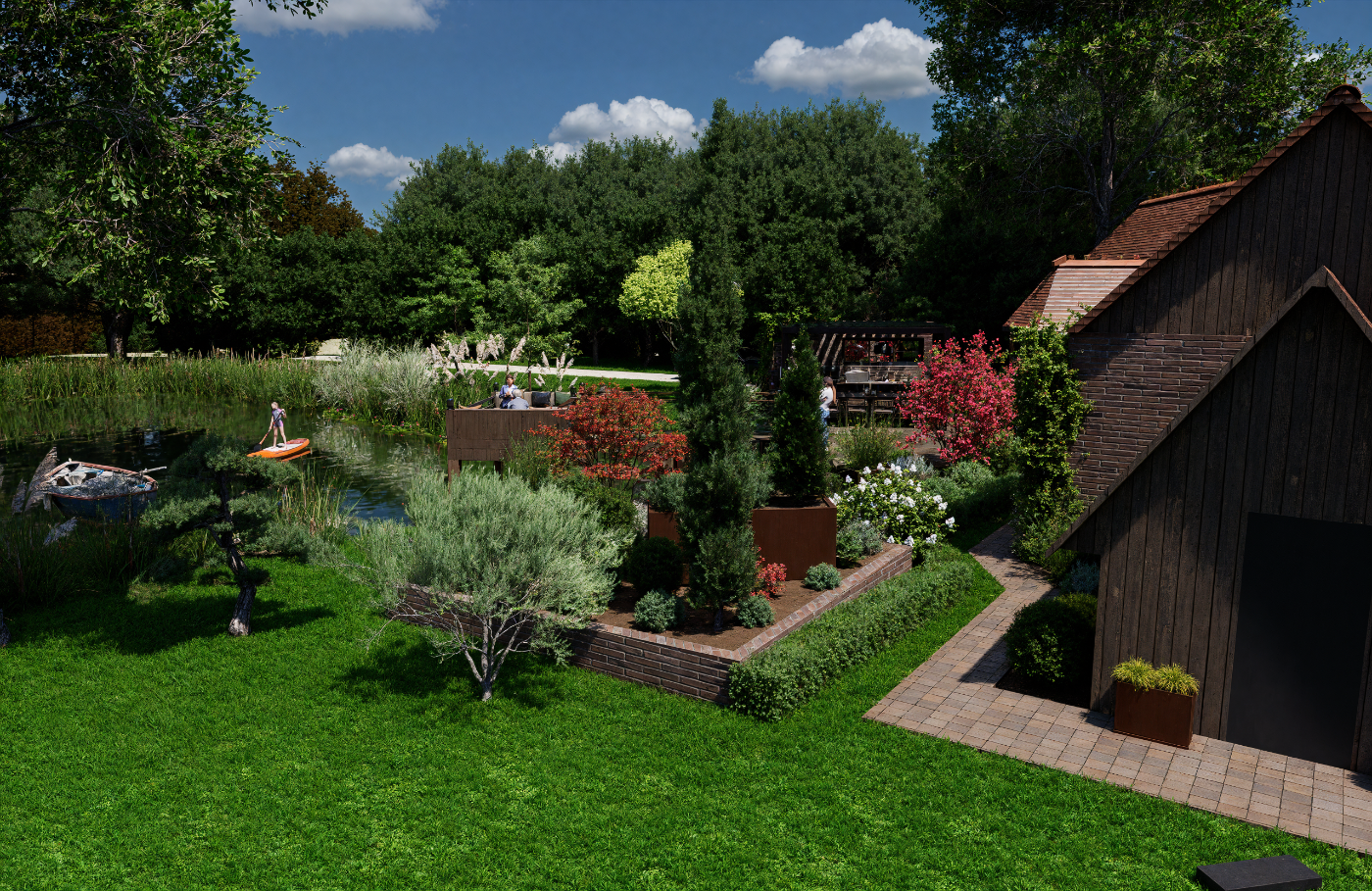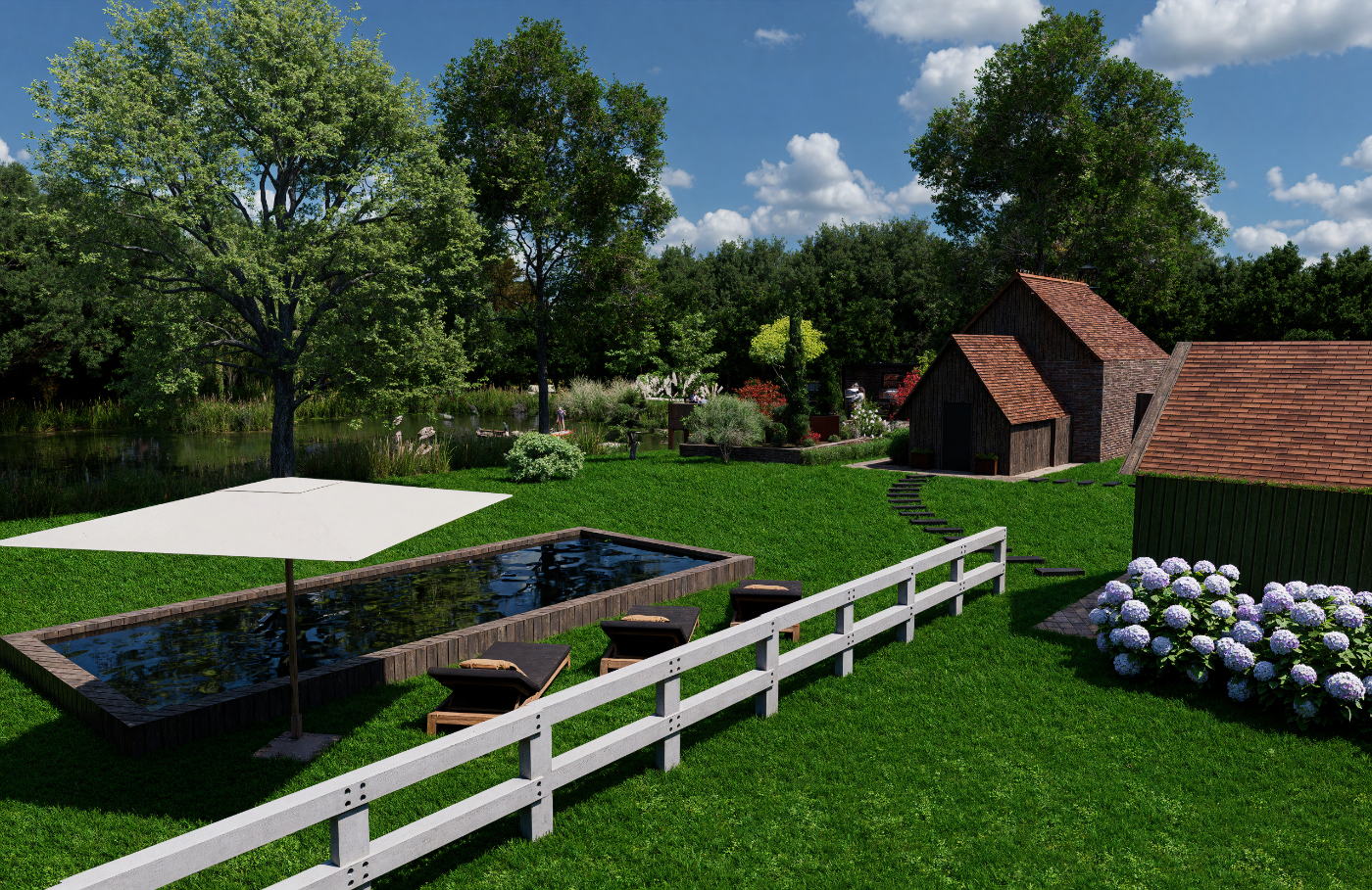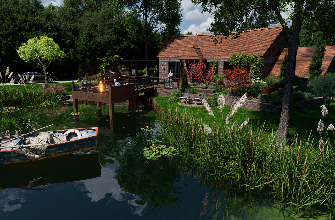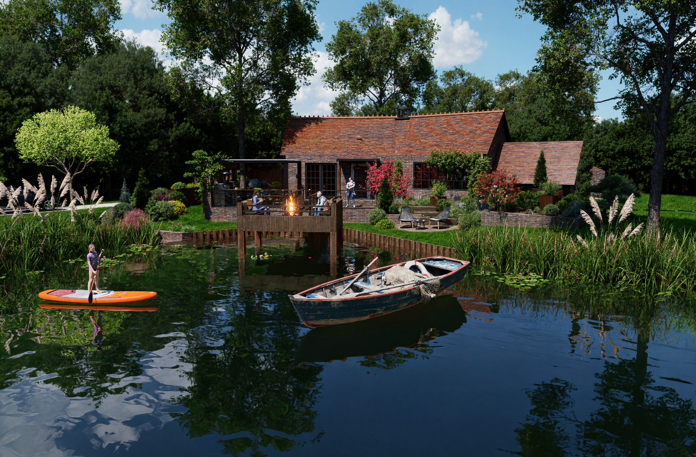 Projet d’aménagement d’une maison de style anglais en Sologne, intégrant l’étang existant, une cuisine extérieure, un ponton et un espace brasero, pour créer un lieu de vie élégant et convivial en parfaite harmonie avec le paysage naturel