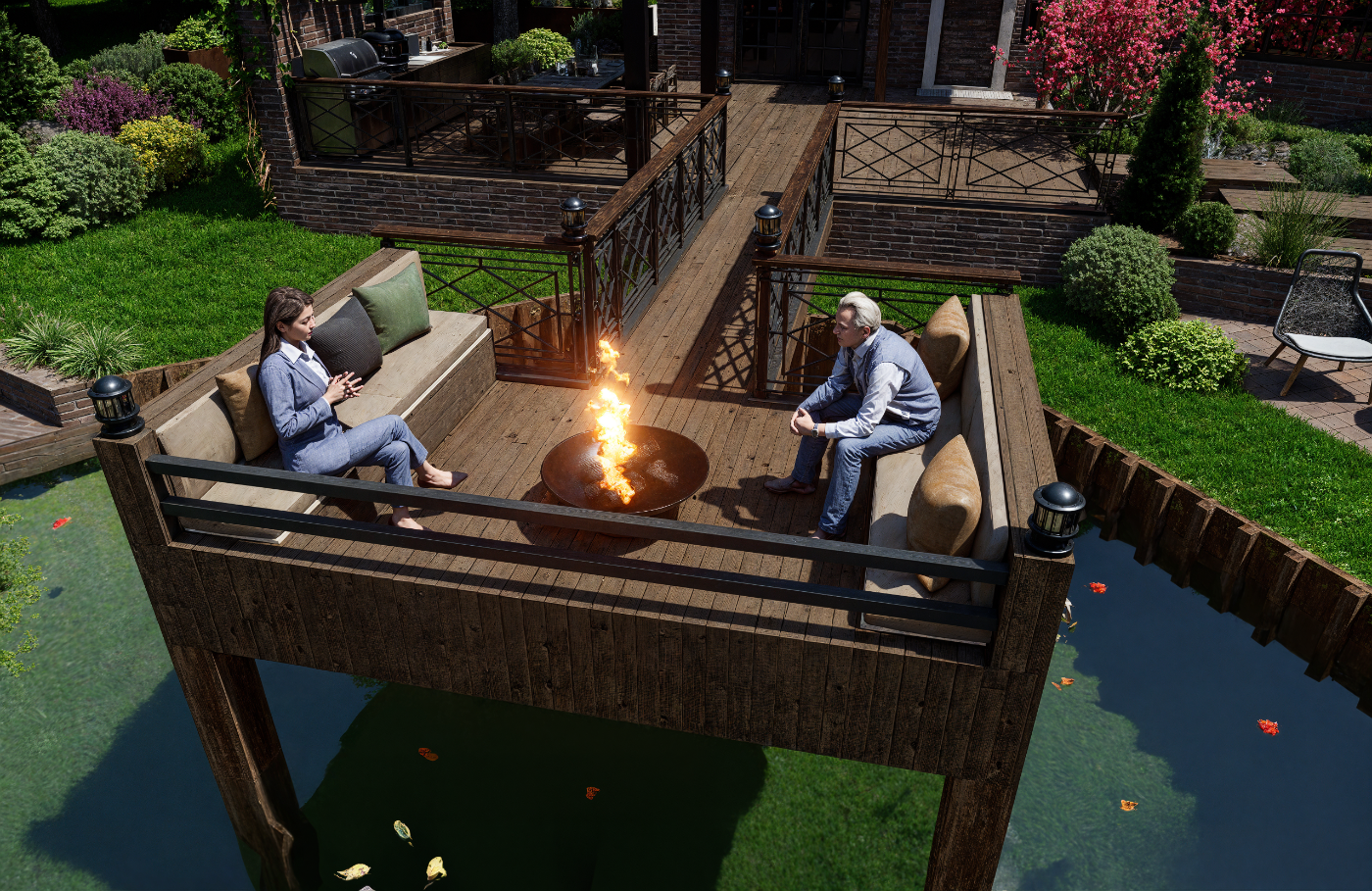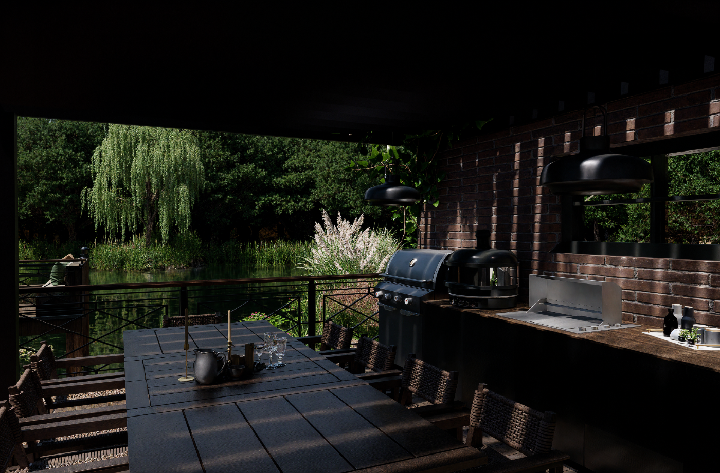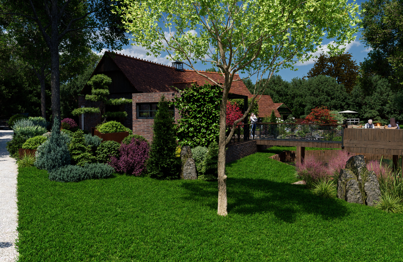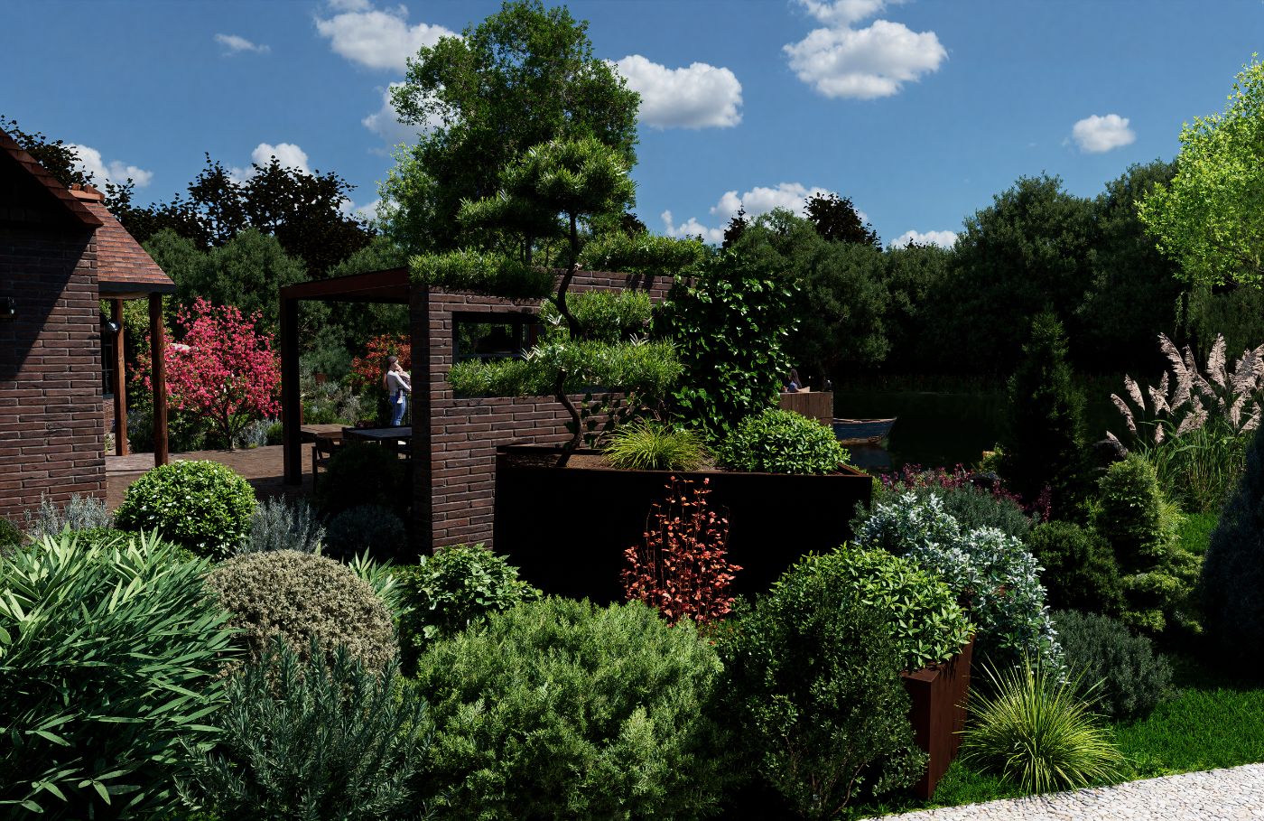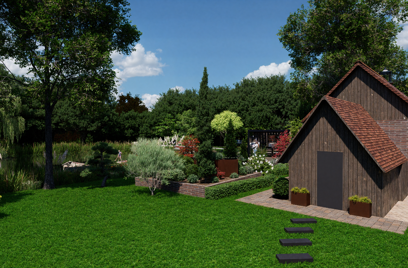 Projet d’aménagement d’une maison de style anglais en Sologne, intégrant l’étang existant, une cuisine extérieure, un ponton et un espace brasero, pour créer un lieu de vie élégant et convivial en parfaite harmonie avec le paysage naturel